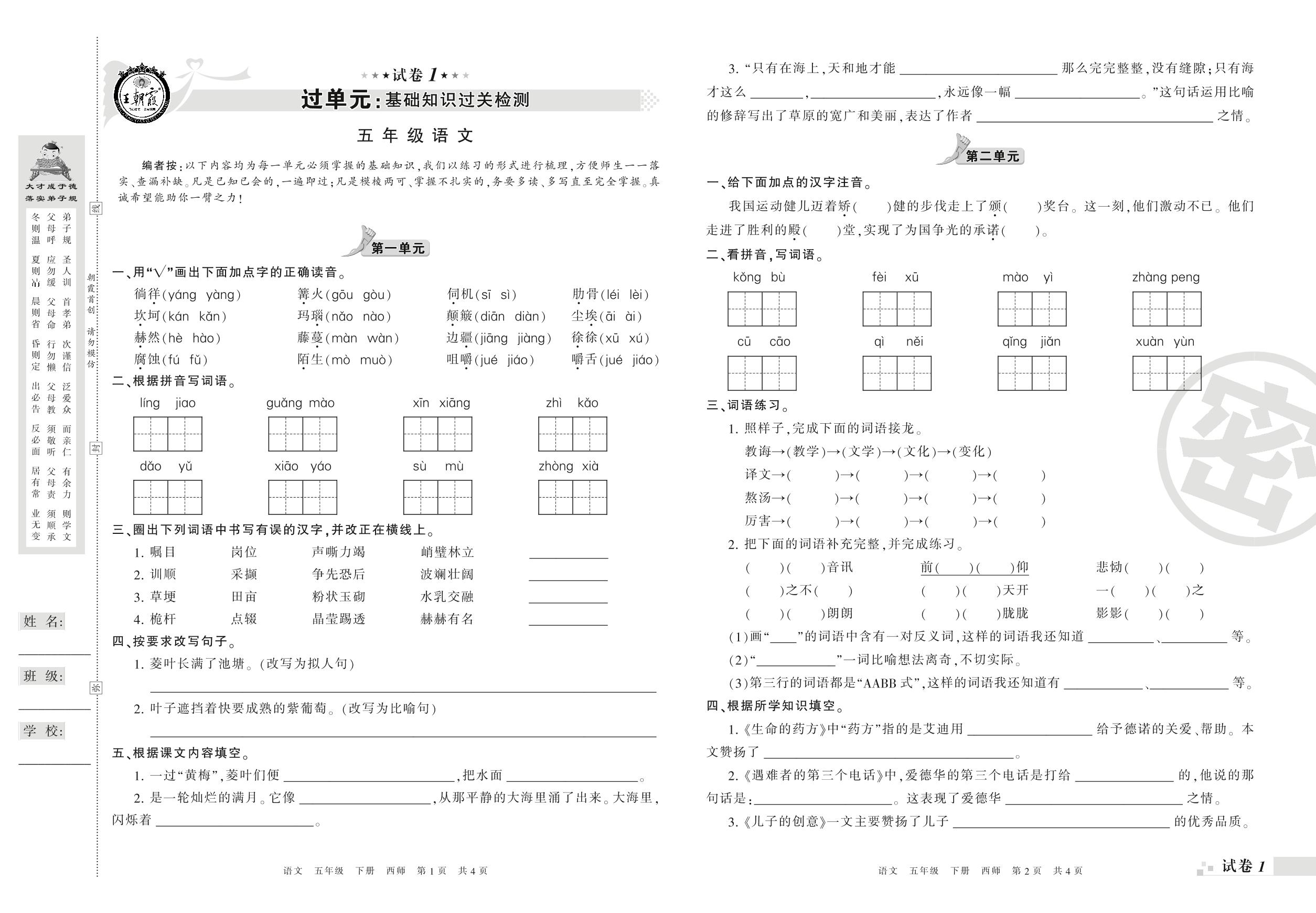 王朝霞期末过单元——基础知识过关检测五年级下册语文(西师版)【1】