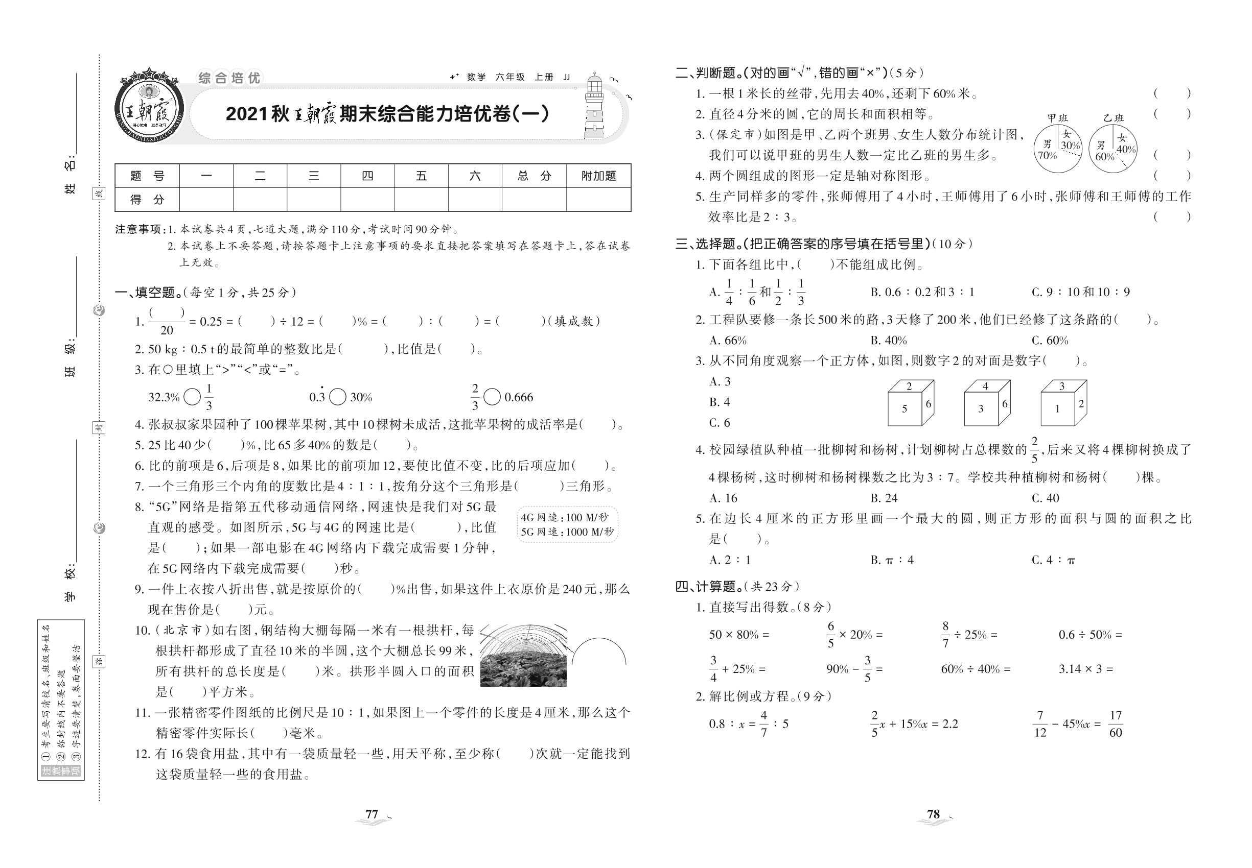 2021上册六年级数学冀教版 王朝霞期末综合能力培优卷(一)