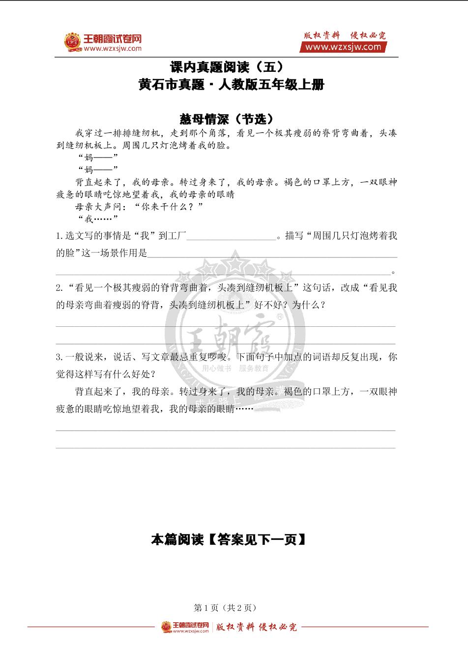 课内真题阅读(五)《慈母情深》人教版五年级上册