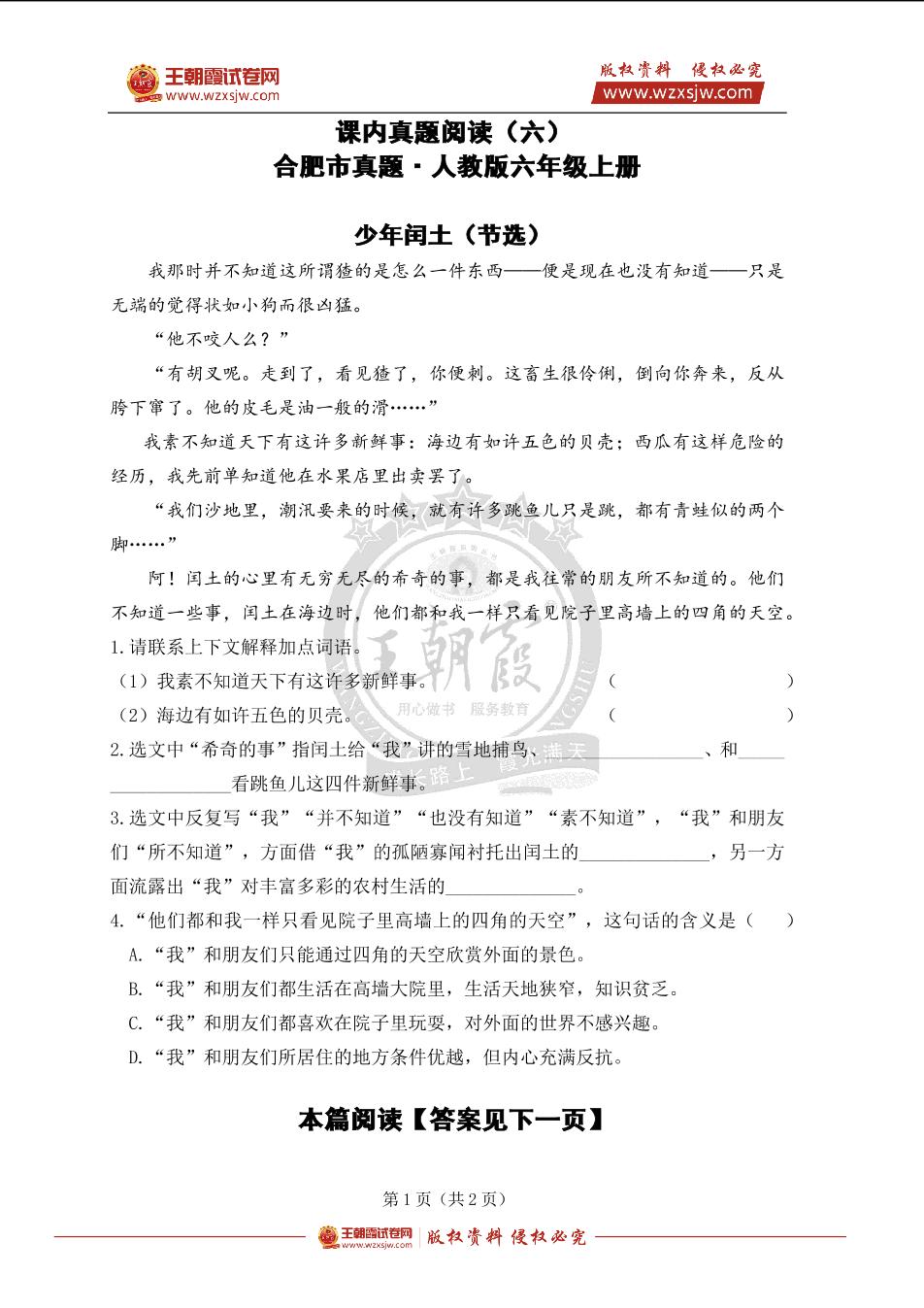 课内真题阅读(六)《少年闰土》人教版六年级上册