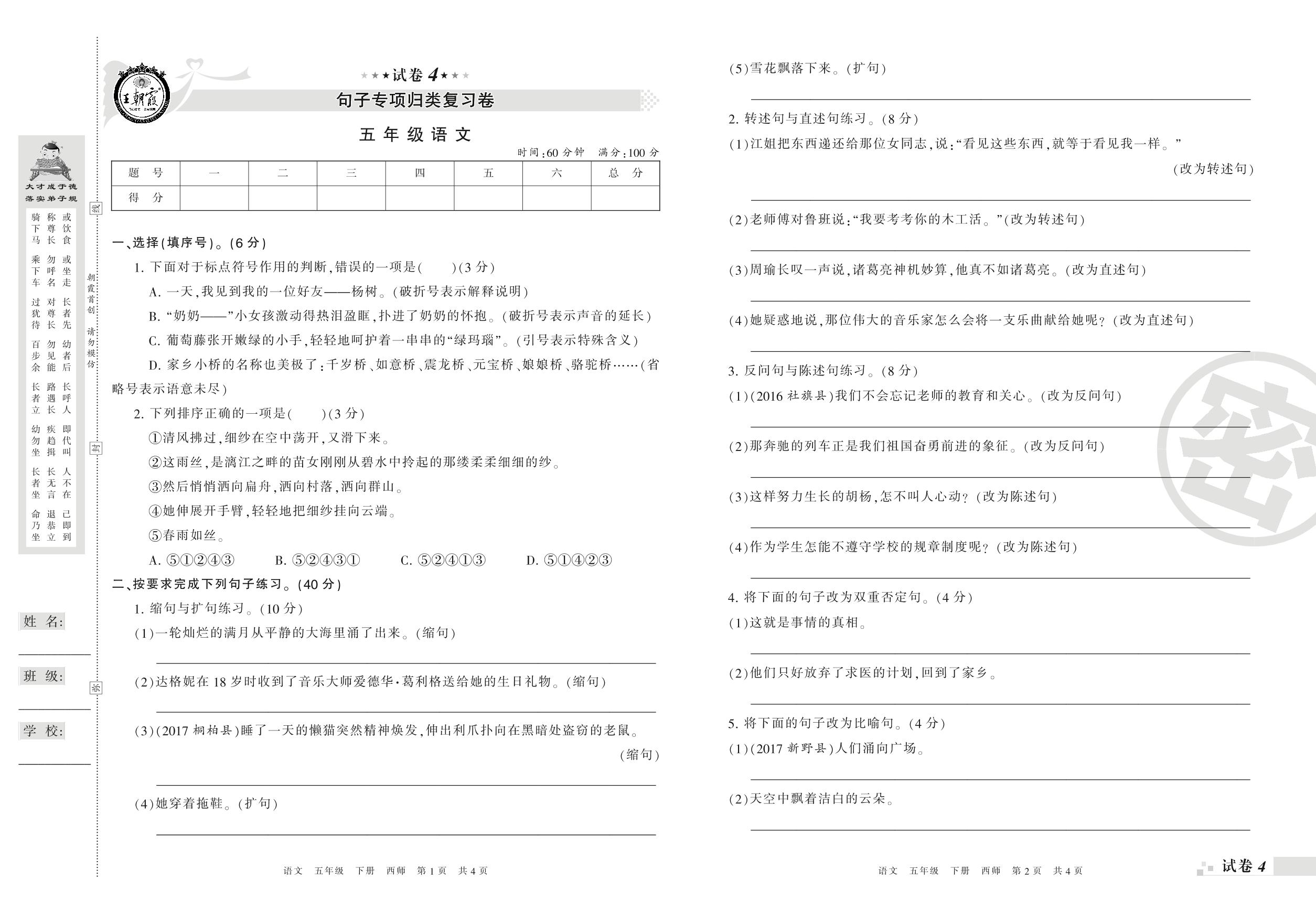 王朝霞期末专项卷——句子专项归类复习卷五年级下册语文(西师版)_R210801210400【4】