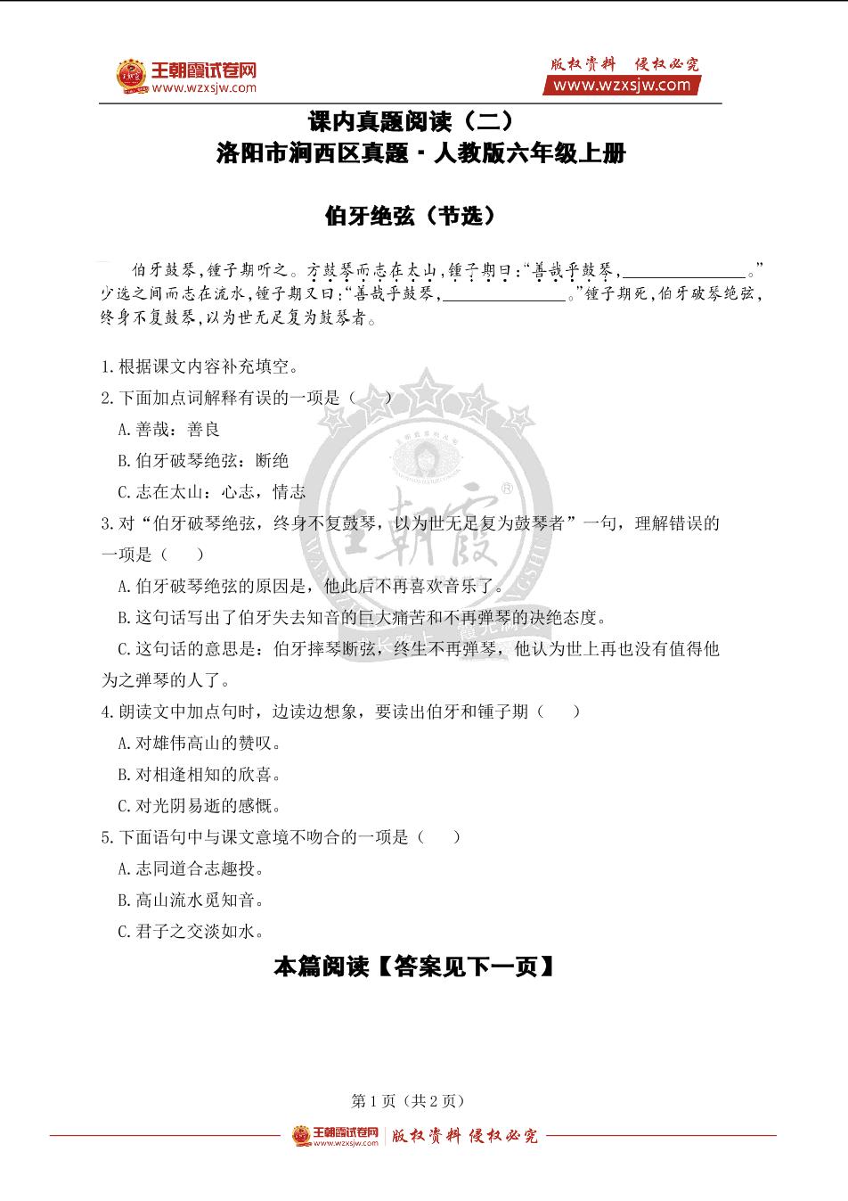 课内真题阅读(二)《伯牙绝弦》人教版六年级上册
