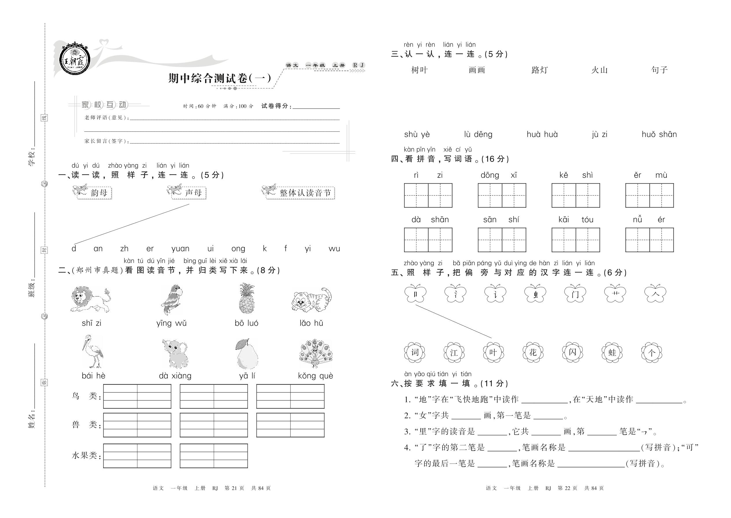 2021上册一年级语文人教版 期中综合测试卷(一)