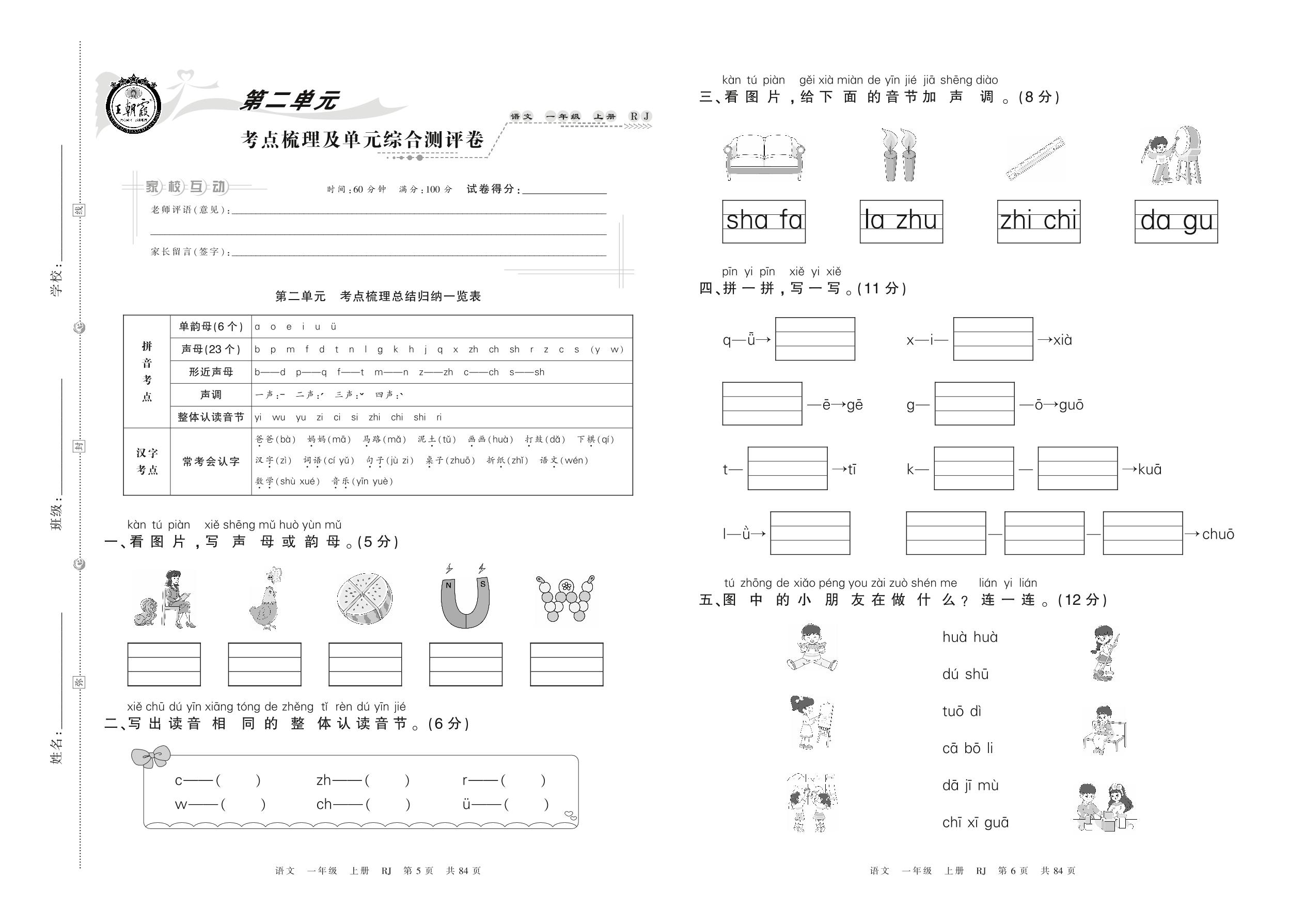 2021上册一年级语文人教版 第二单元 考点梳理及单元综合测评卷