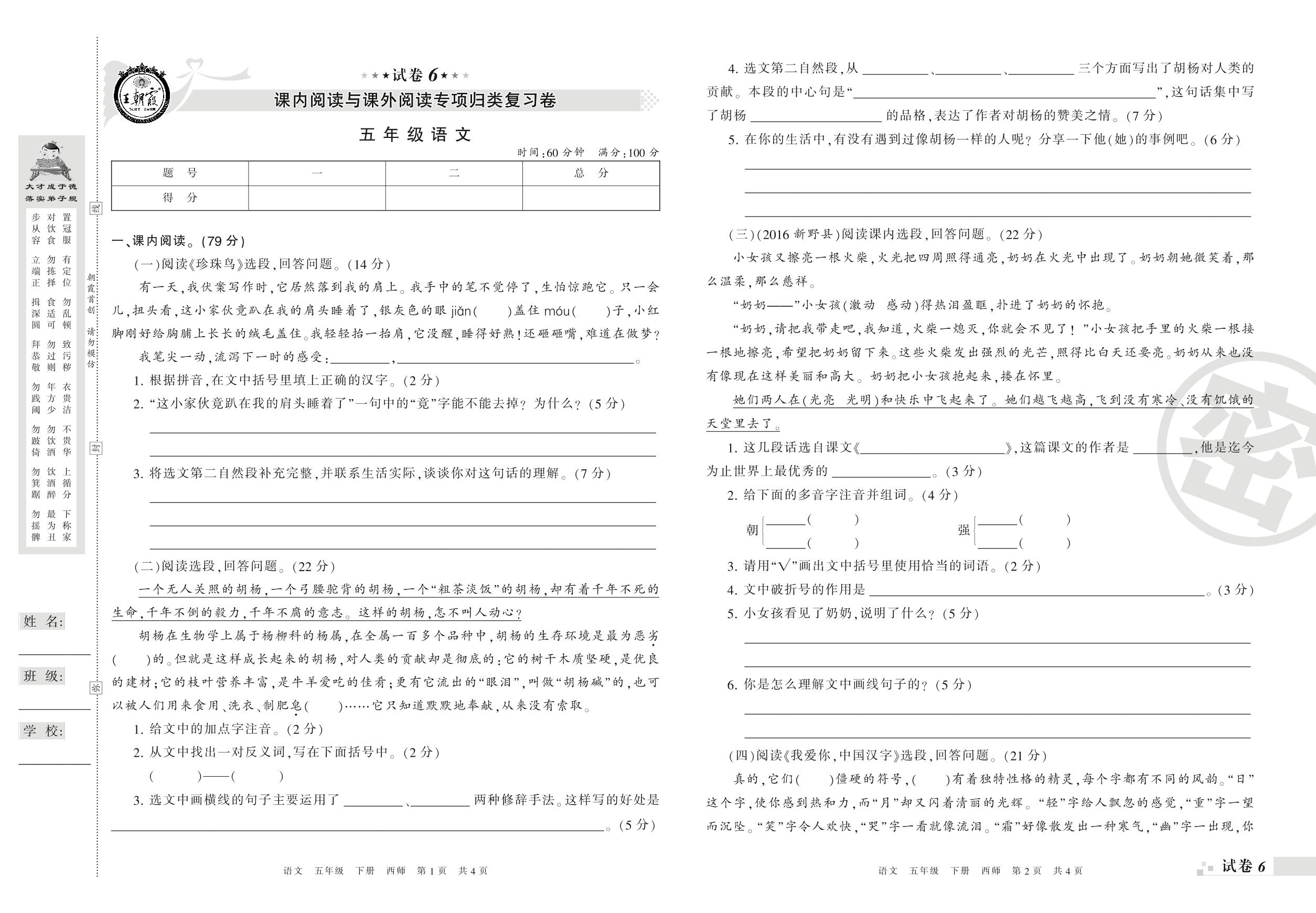 王朝霞期末专项卷——课外阅读与课内阅读专项归类复习卷五年级下册语文(西师版)_R210801210407【6】