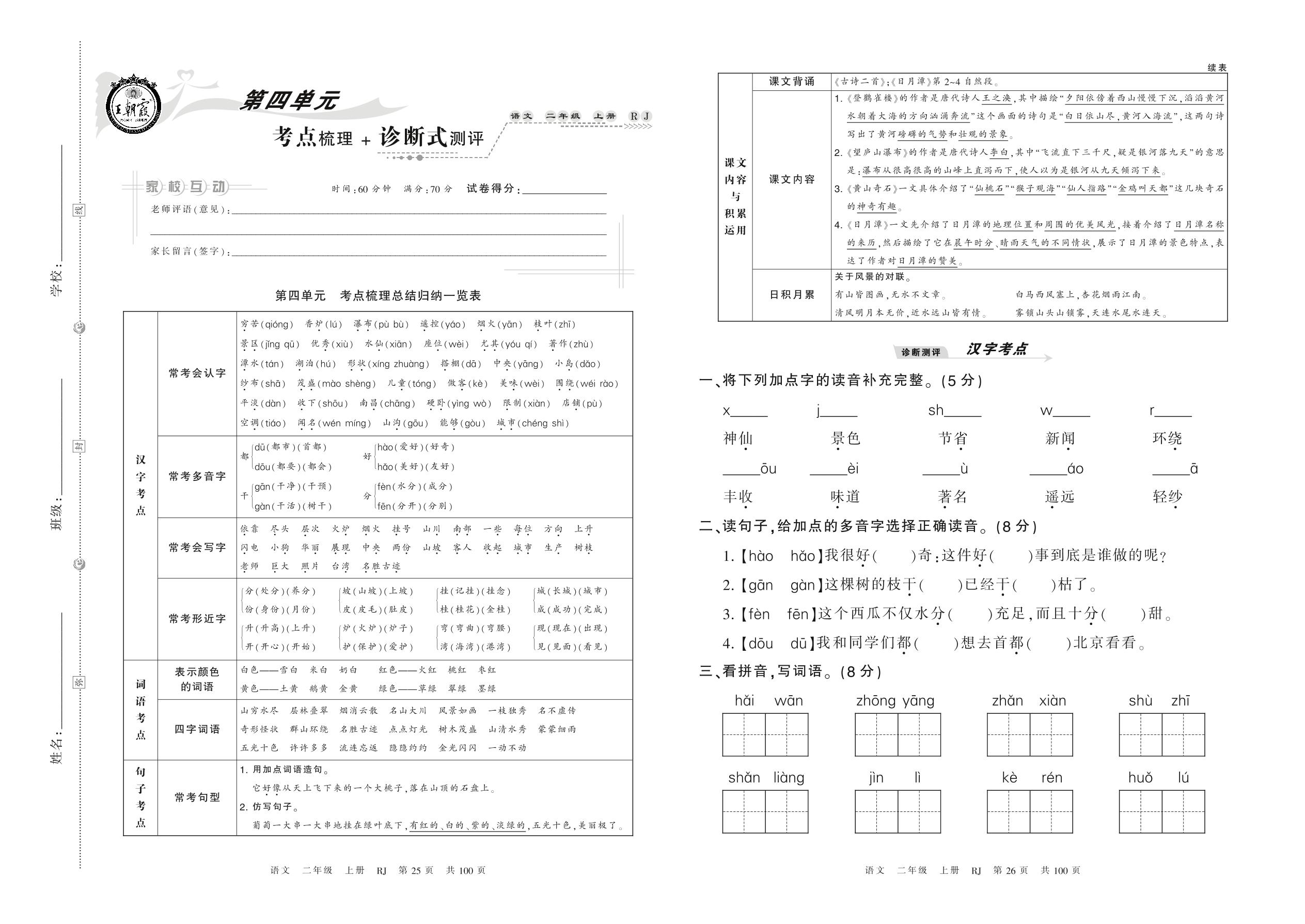 2021上册二年级语文人教版 第四单元 考点梳理 + 诊断式测评