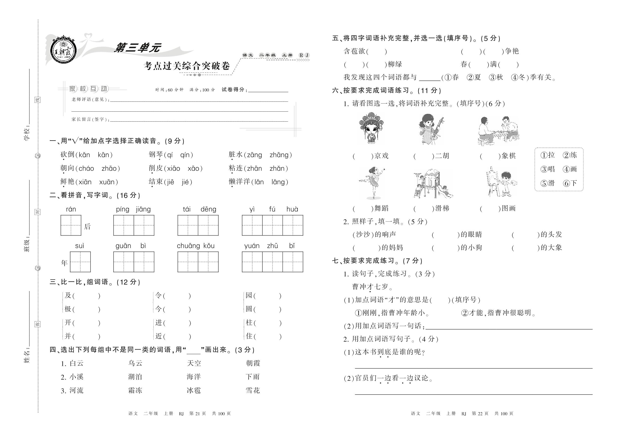 2021上册二年级语文人教版 第三单元 考点过关综合突破卷