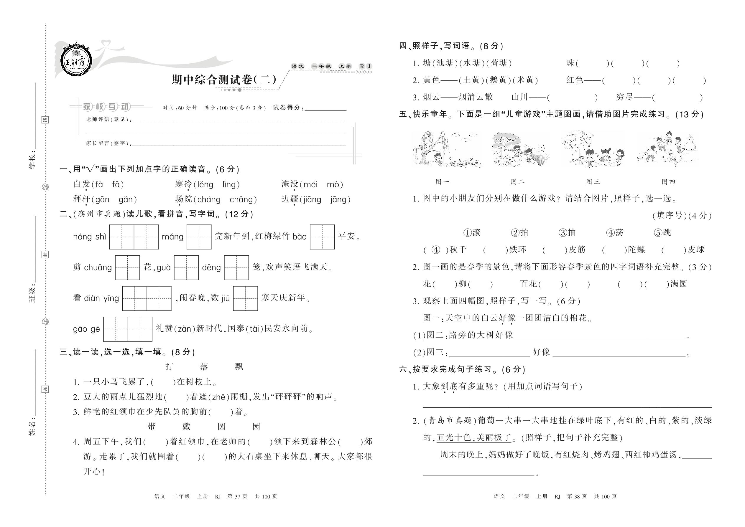 2021上册二年级语文人教版 期中综合测试卷(二)