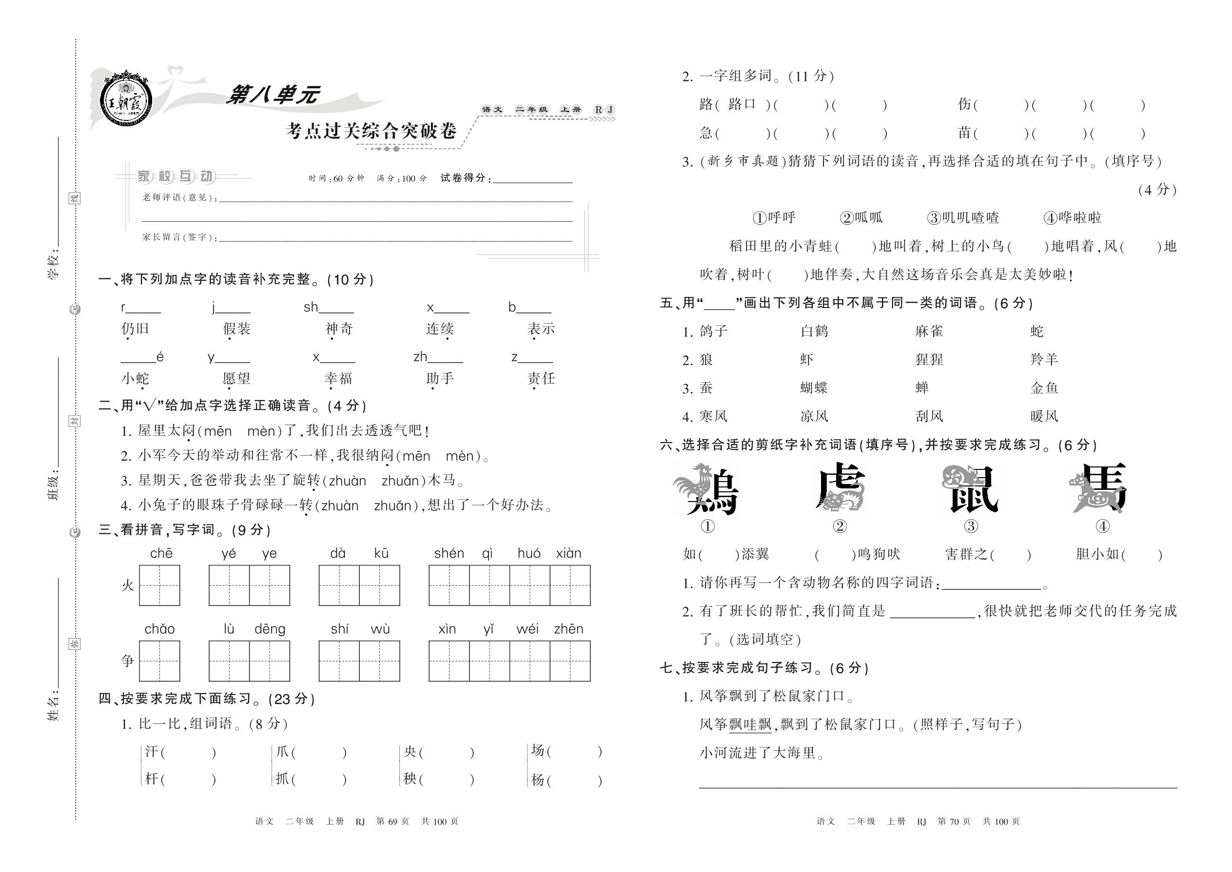 2021上册二年级语文人教版 第八单元 考点过关综合突破卷