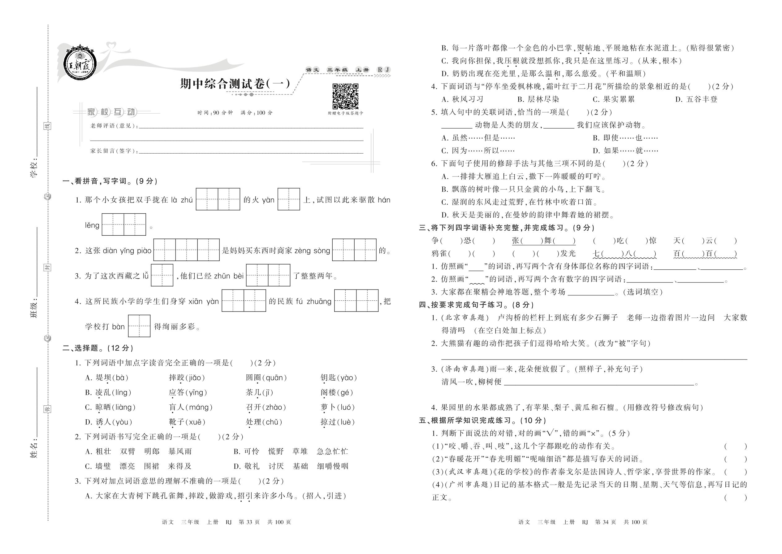 2021上册三年级语文人教版 期中综合测试卷(一)