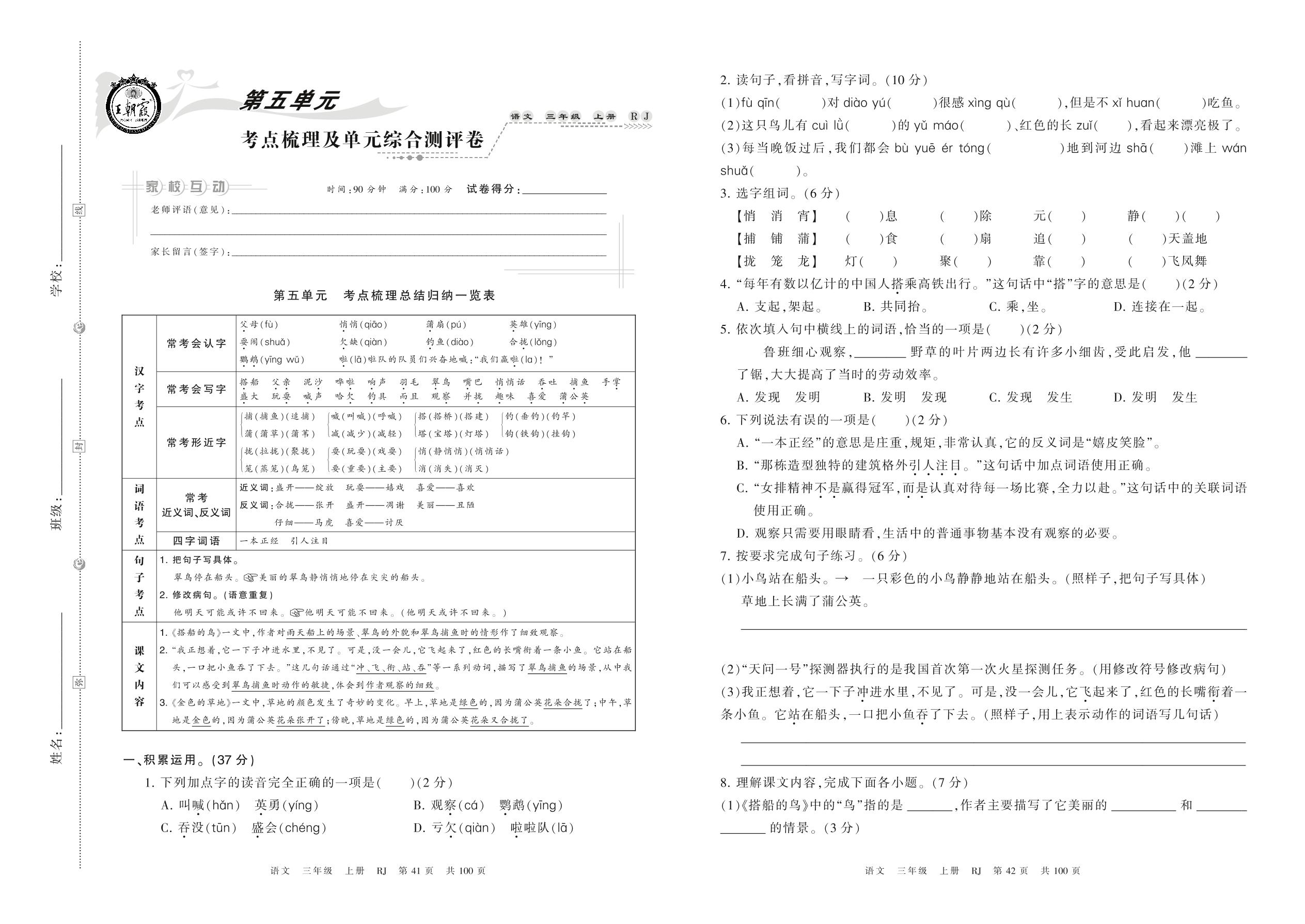 2021上册三年级语文人教版 第五单元 考点梳理及单元综合测评卷
