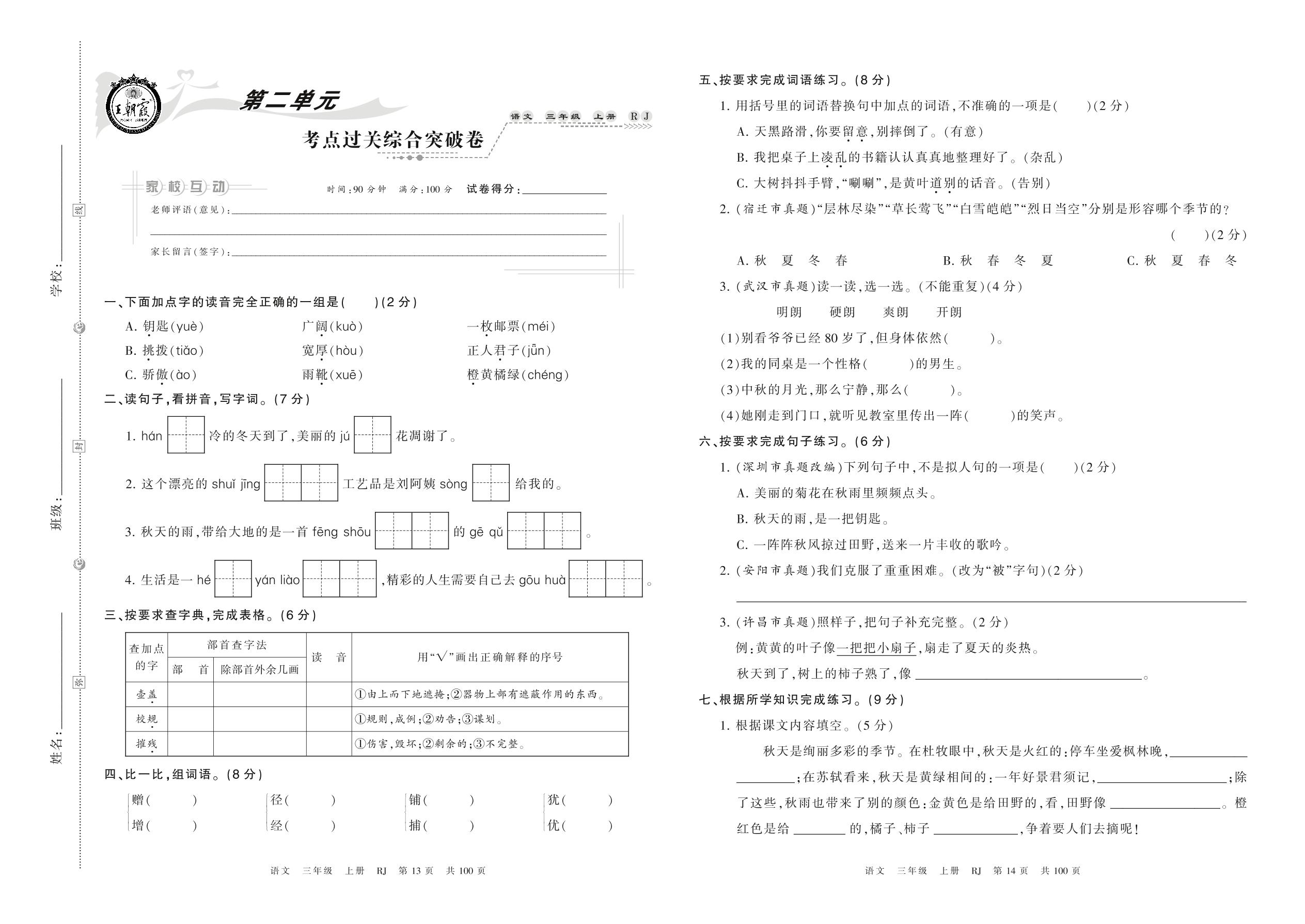2021上册三年级语文人教版 第二单元 考点过关综合突破卷