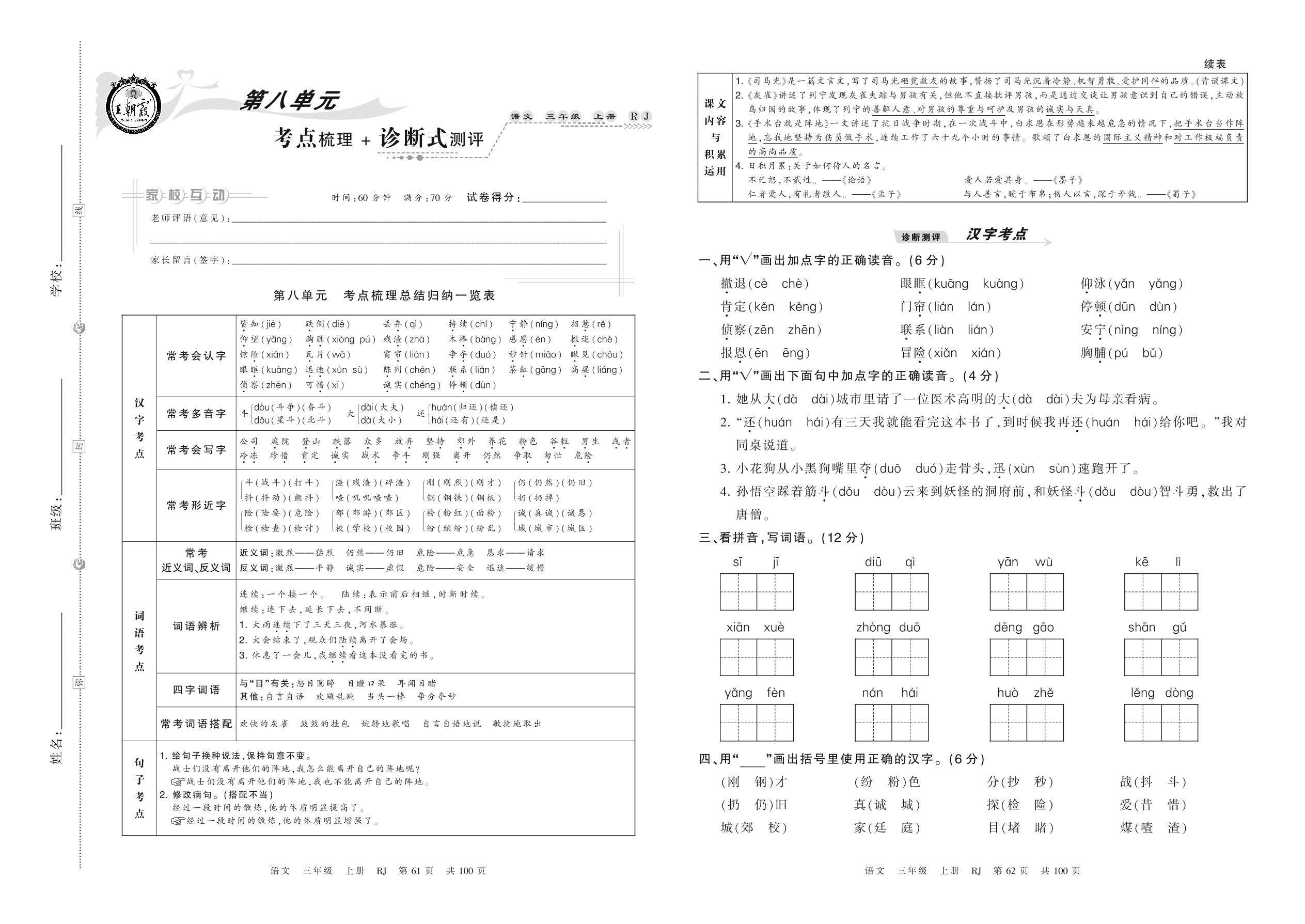 2021上册三年级语文人教版 第八单元 考点梳理 + 诊断式测评