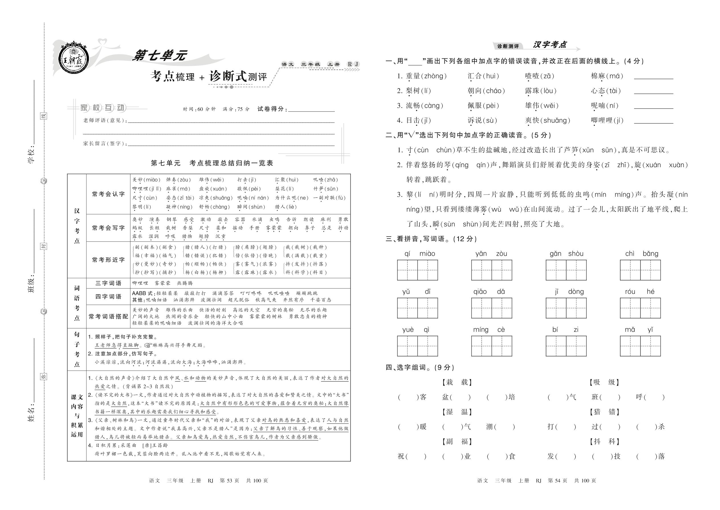 2021上册三年级语文人教版 第七单元 考点梳理 + 诊断式测评