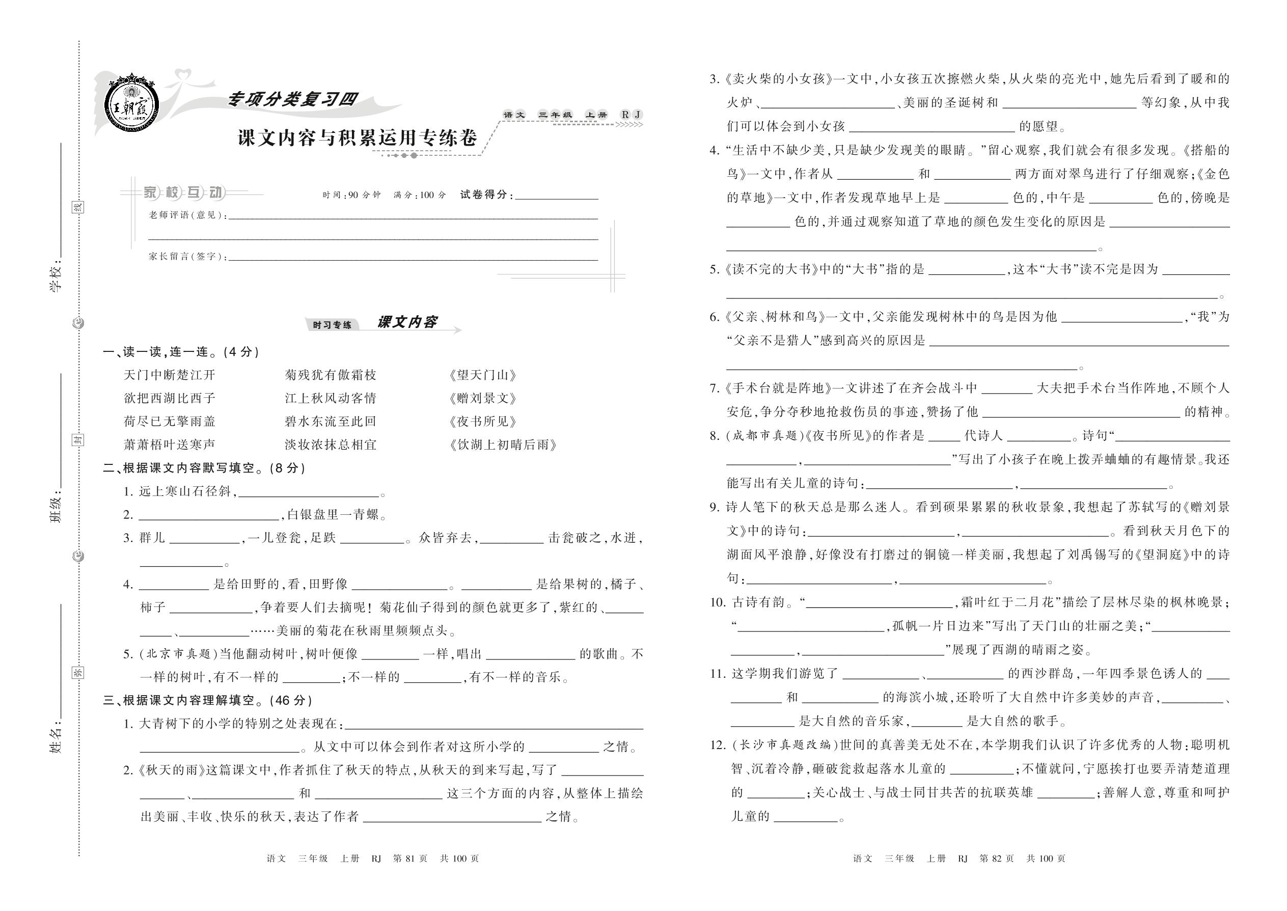 2021上册三年级语文人教版 课文内容与积累运用专练卷