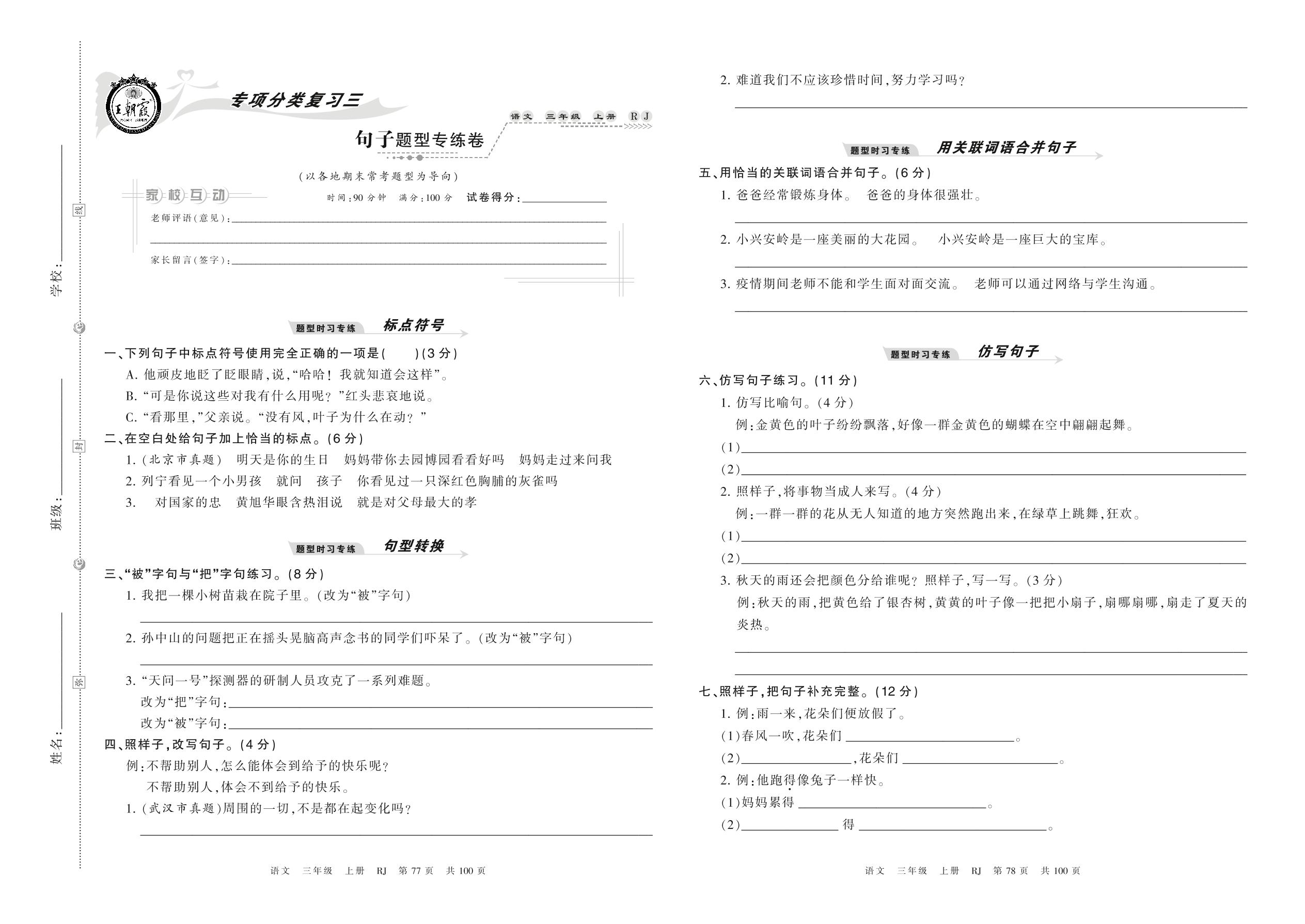 2021上册三年级语文人教版 句子题型专练卷
