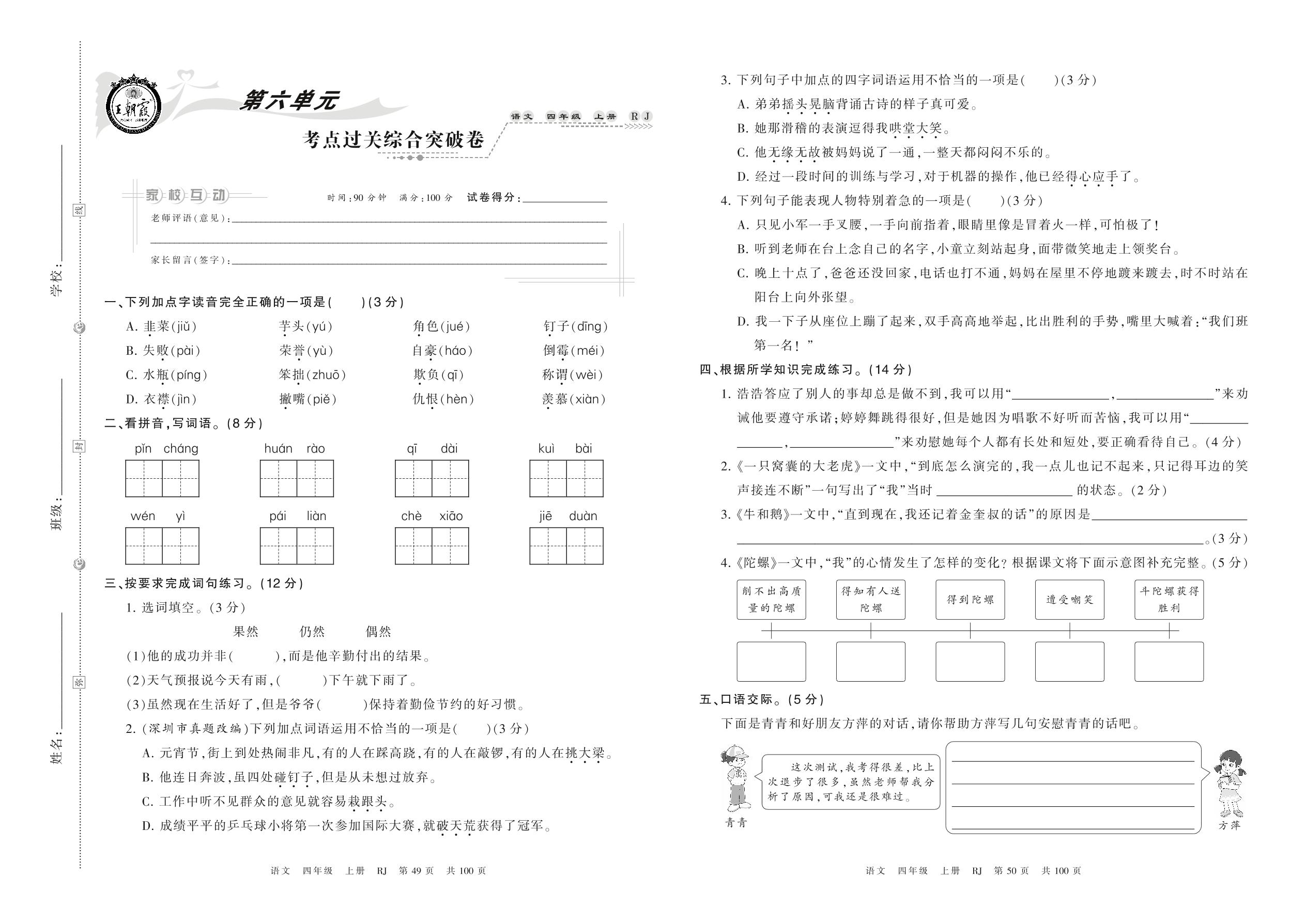 2021上册四年级语文人教版 第六单元 考点过关综合突破卷
