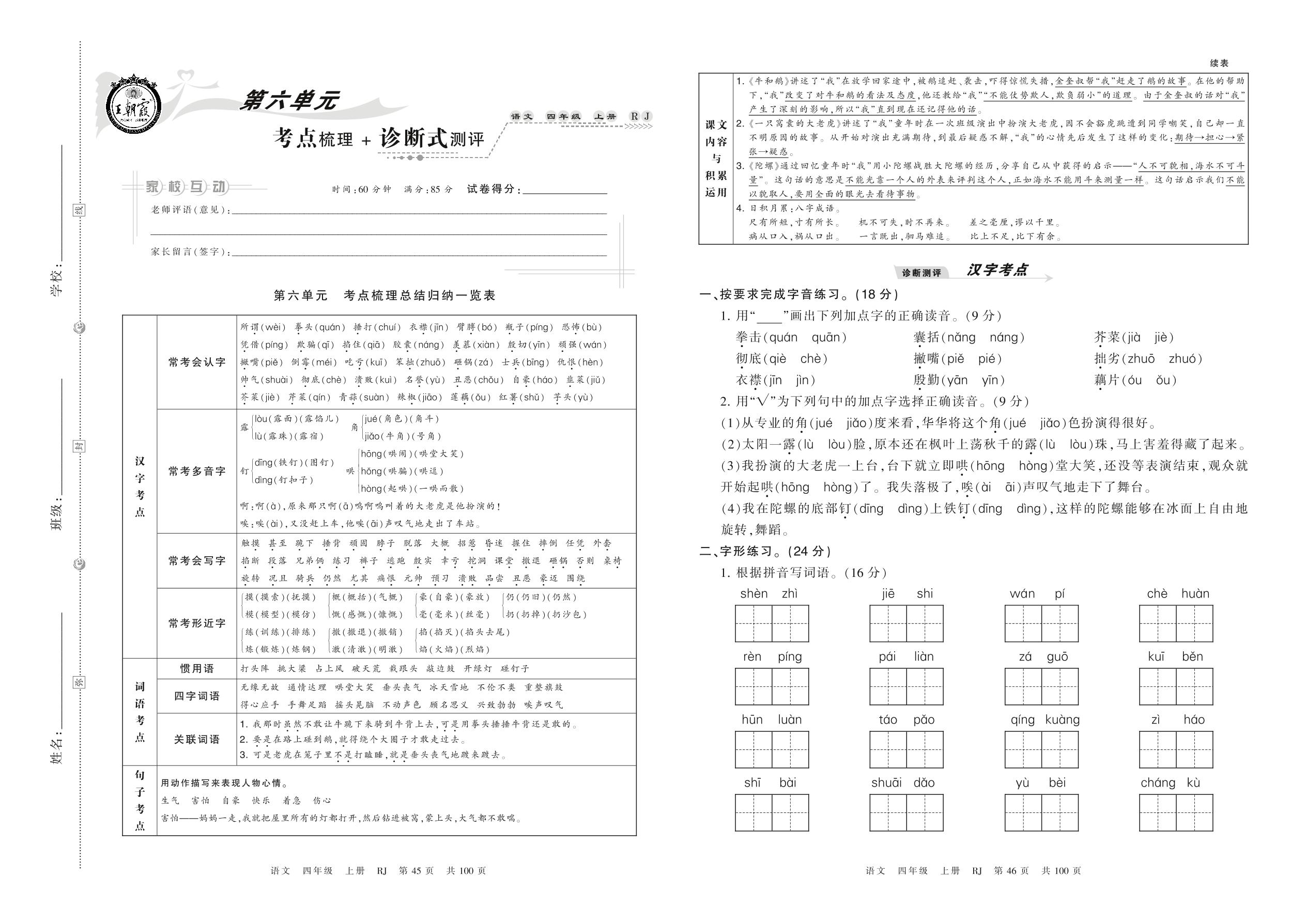 2021上册四年级语文人教版 第六单元 考点梳理 + 诊断式测评