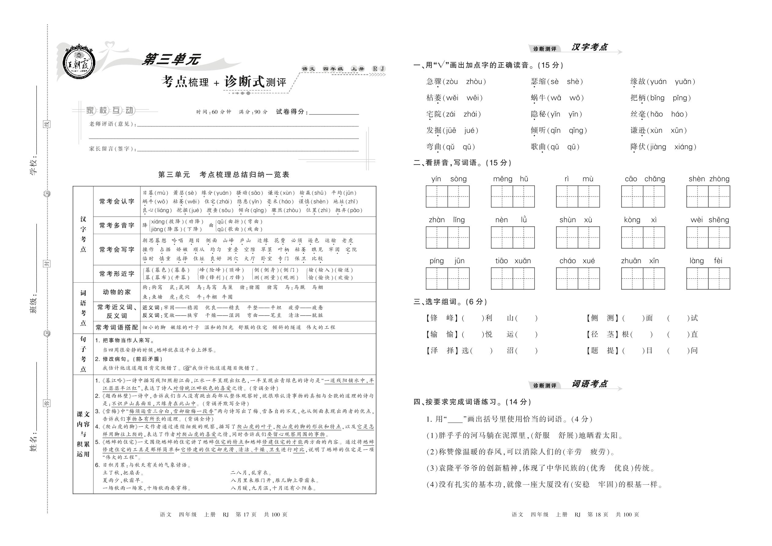 2021上册四年级语文人教版 第三单元 考点梳理 + 诊断式测评