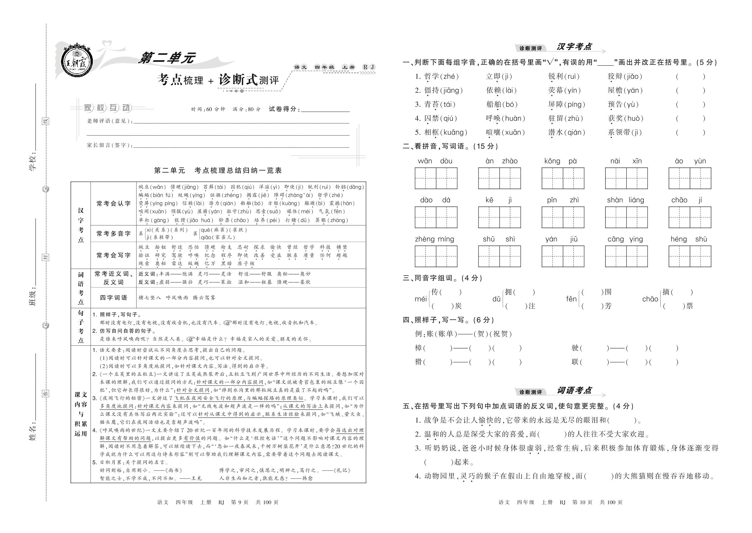 2021上册四年级语文人教版 第二单元 考点梳理 + 诊断式测评