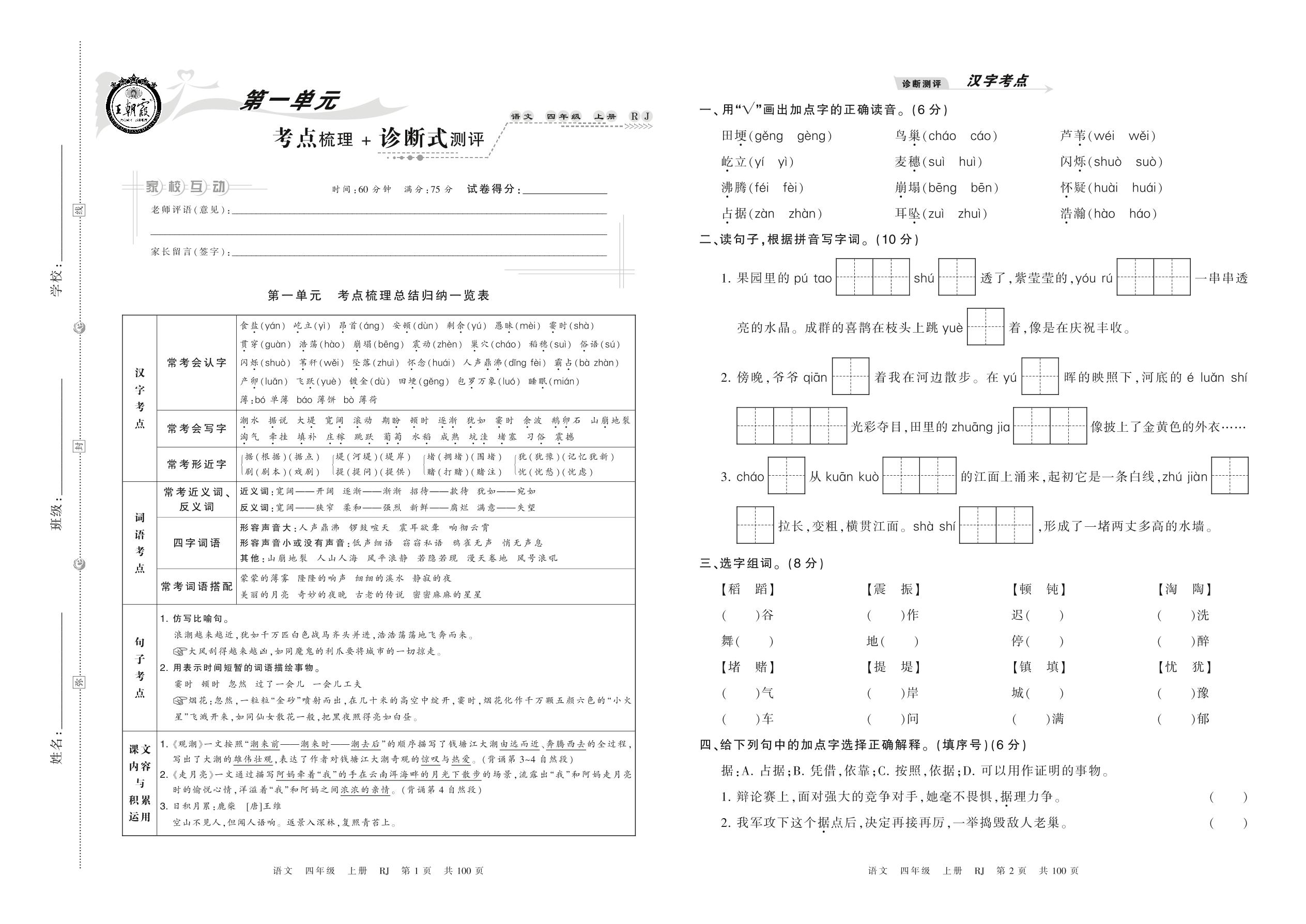 2021上册四年级语文人教版 第一单元 考点梳理 + 诊断式测评
