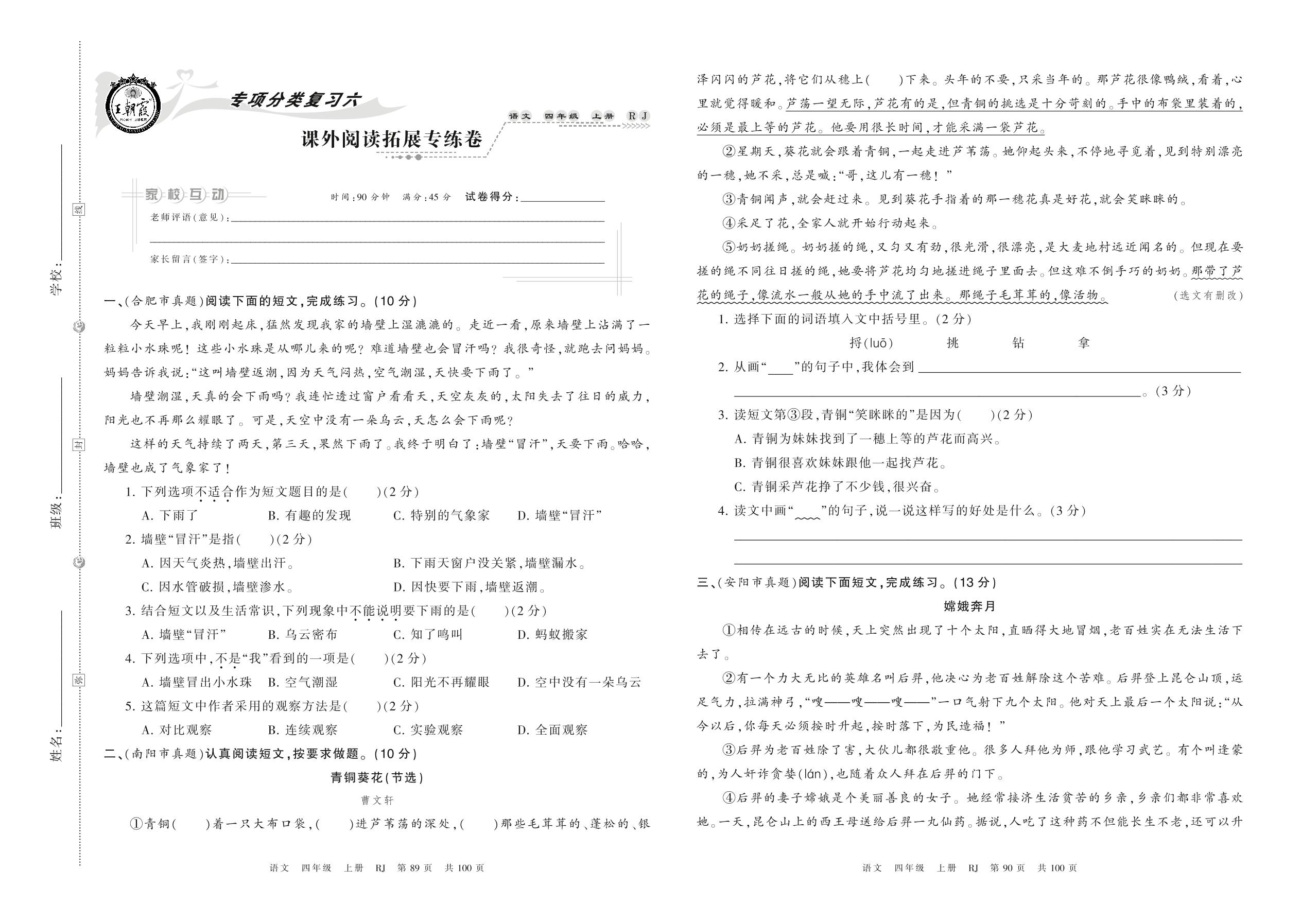 2021上册四年级语文人教版 课外阅读拓展专练卷