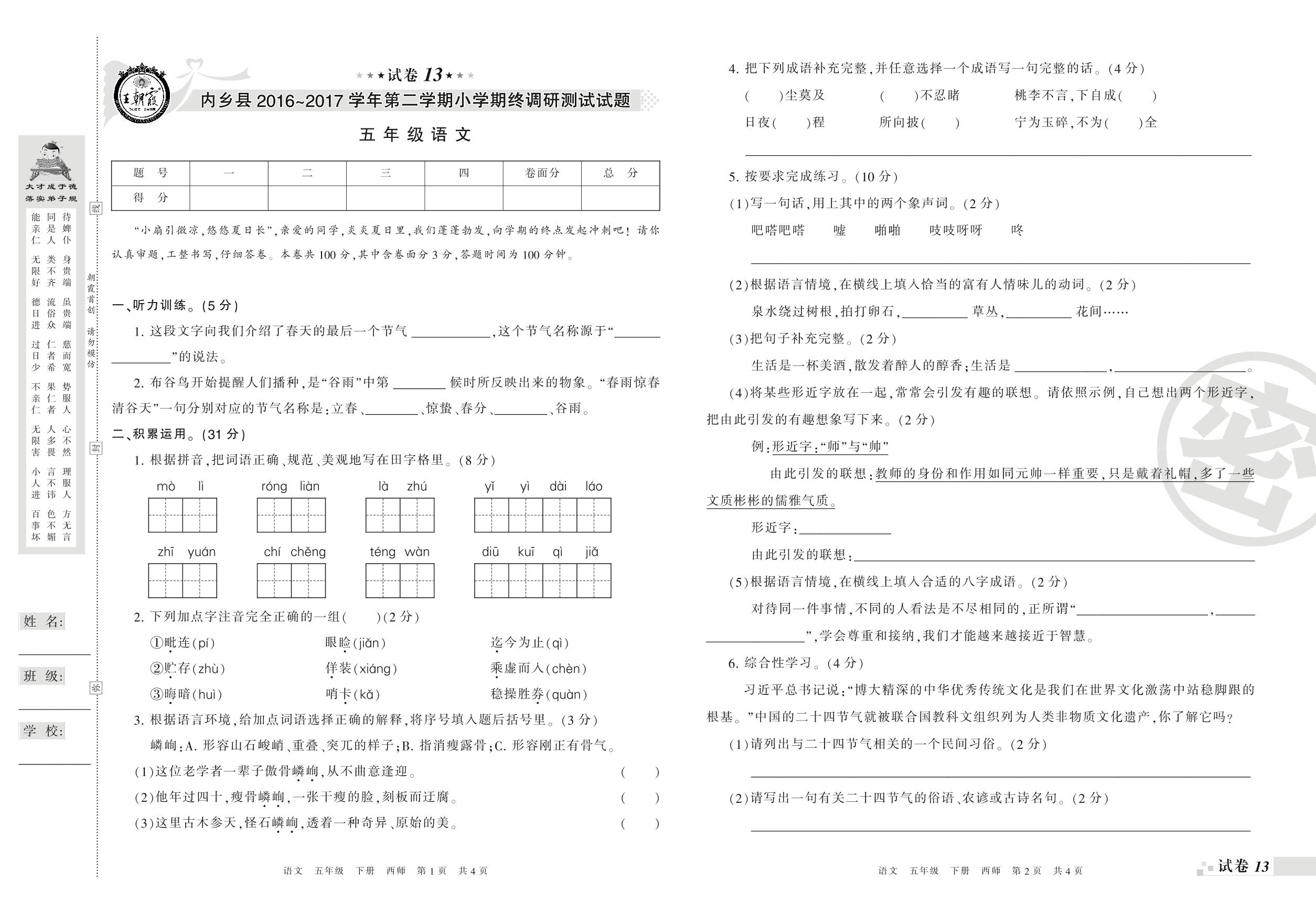 2016-2017学年第二学期南阳市内乡县五年级语文试卷(西师版)_R210801210447【13】