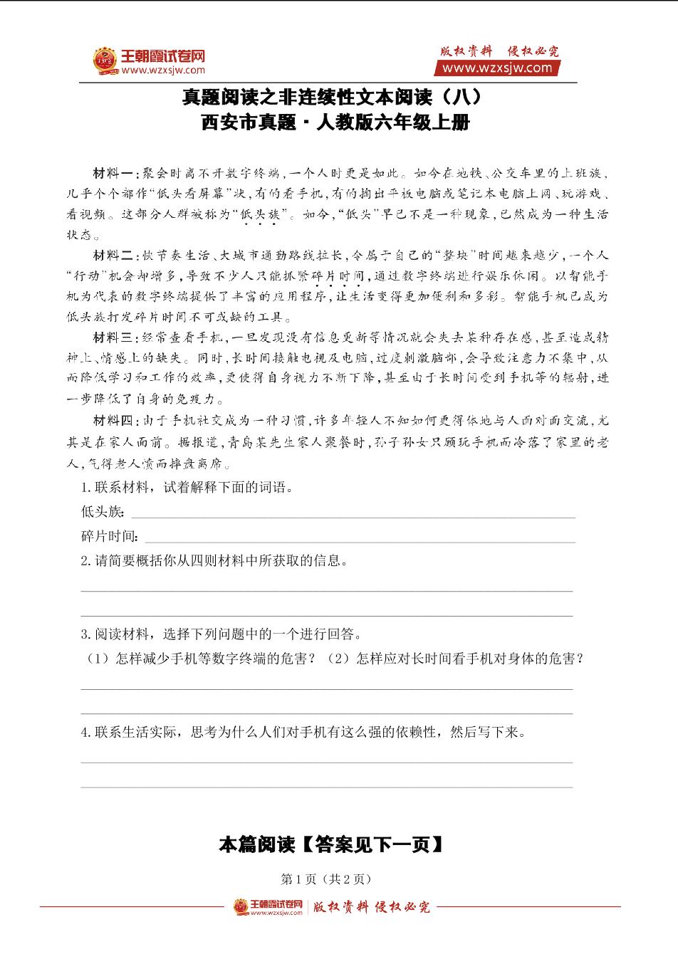 人教版六年级上册·非连续性文本阅读训练(八)
