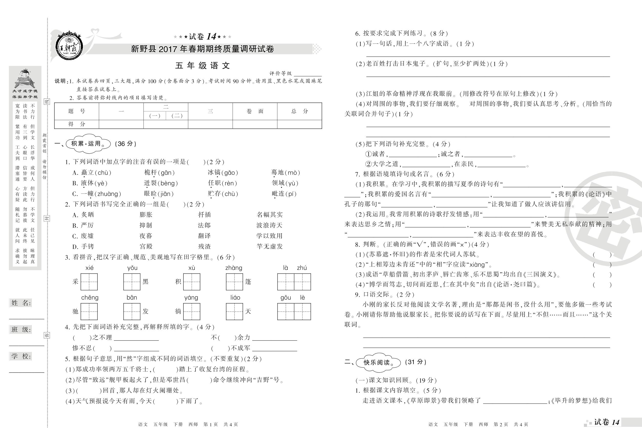 2016-2017学年第二学期南阳市新野县五年级语文试卷(西师版)【14】