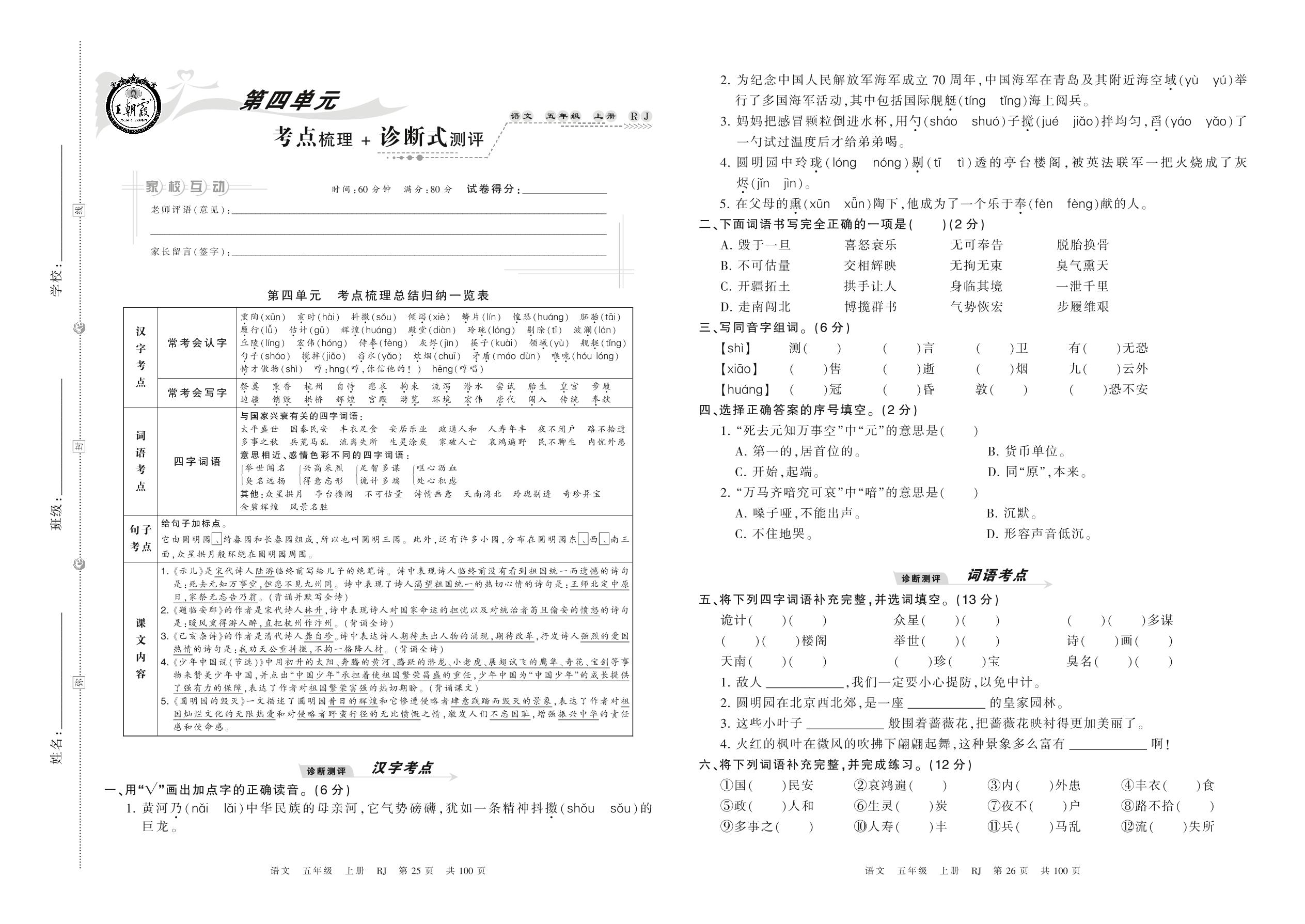 2021上册五年级语文人教版 第四单元 考点梳理 + 诊断式测评