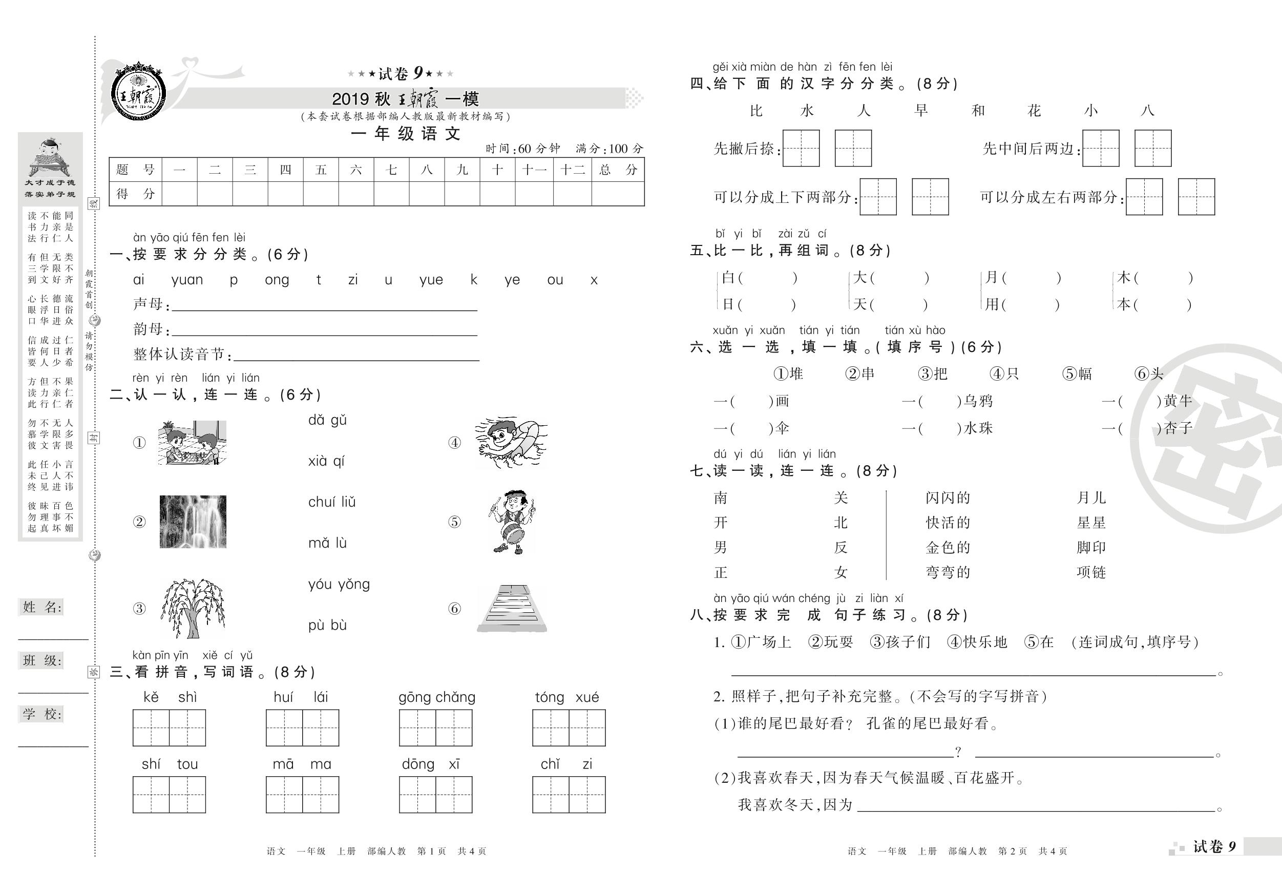 王朝霞期末模拟卷一年级上册语文(人教版)_R210731181837【9】