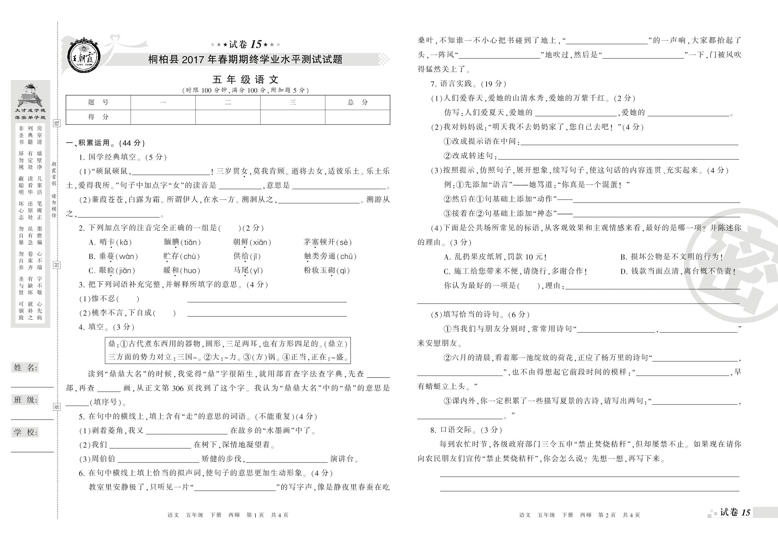 2016-2017学年第二学期南阳市桐柏县五年级语文试卷(西师版)【15】