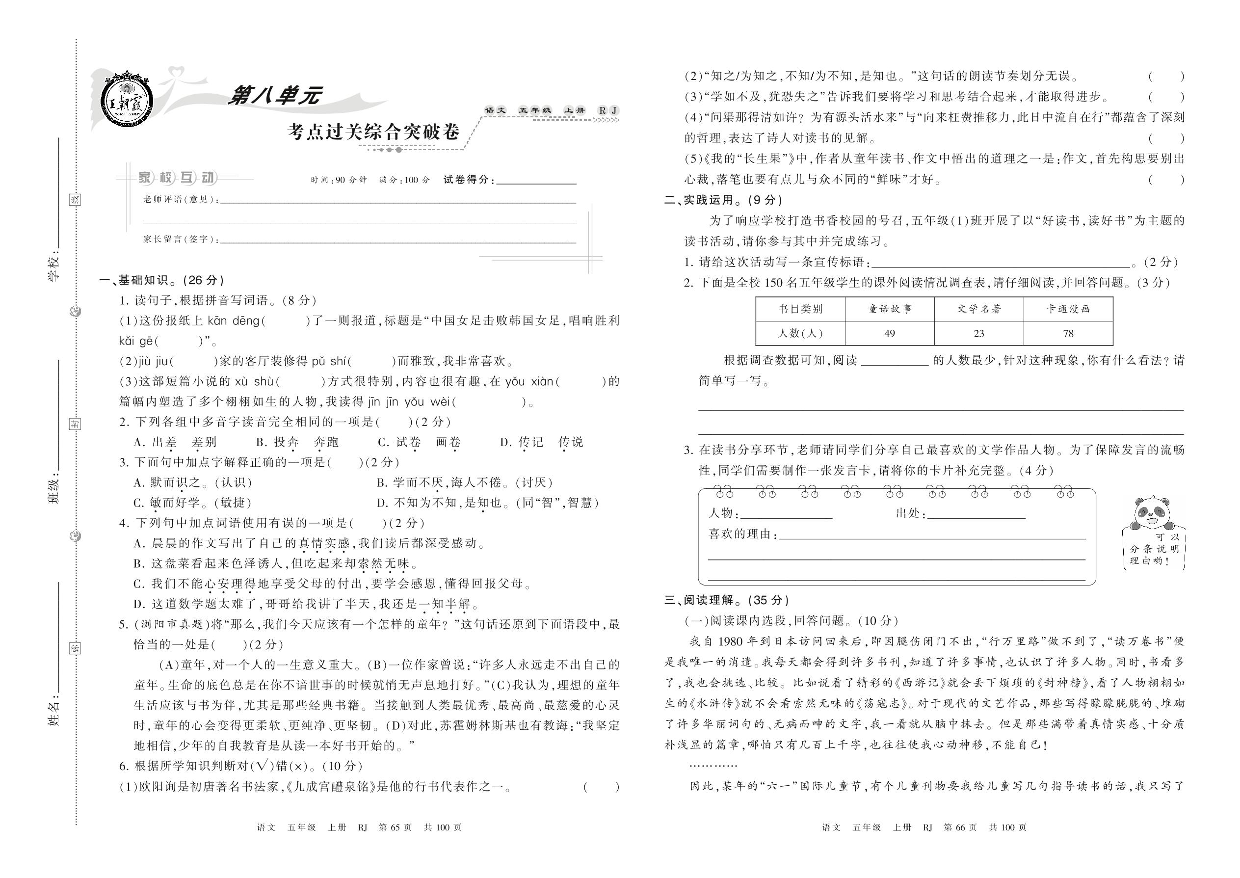 2021上册五年级语文人教版 第八单元 考点过关综合突破卷