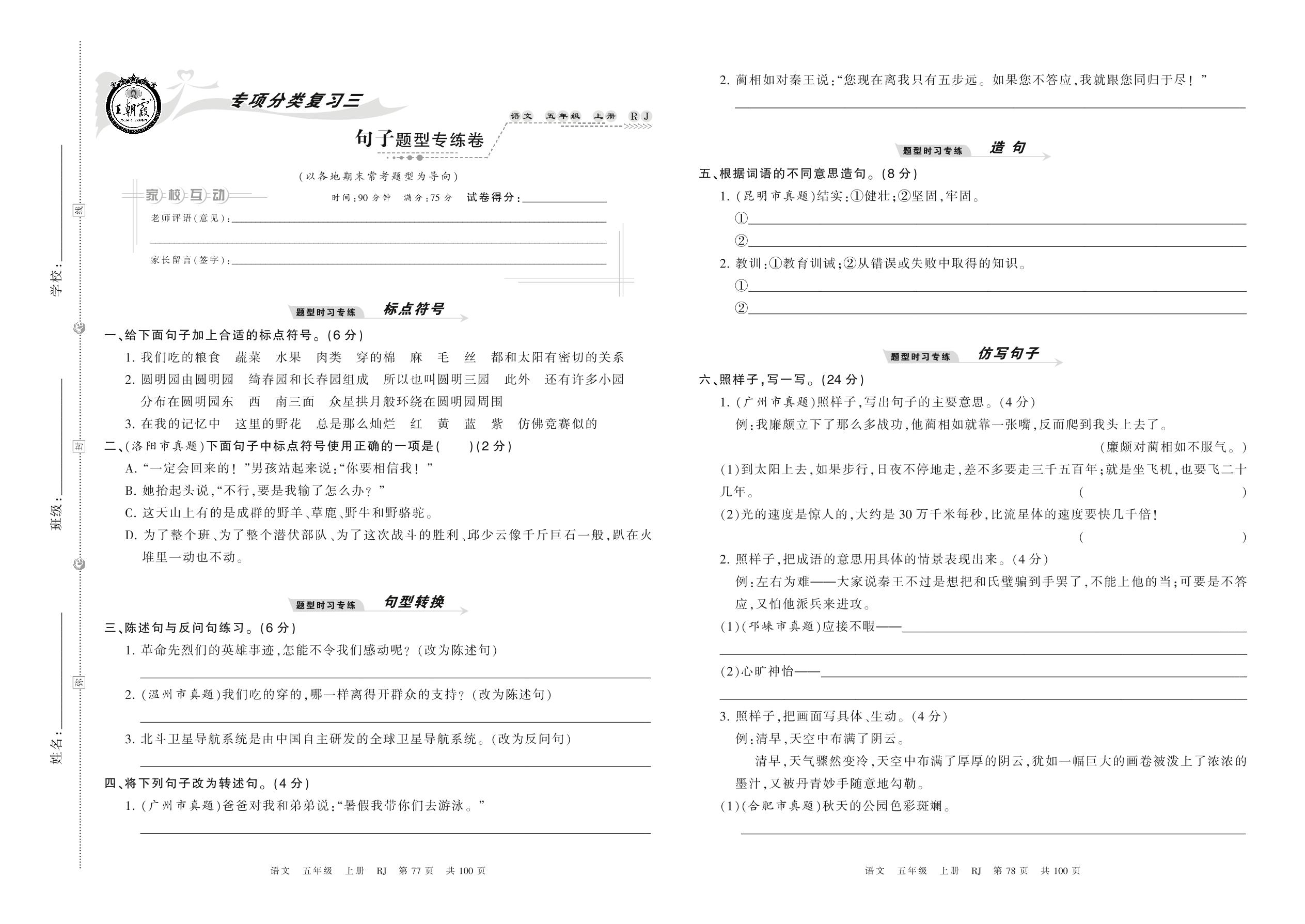 2021上册五年级语文人教版 句子题型专练卷
