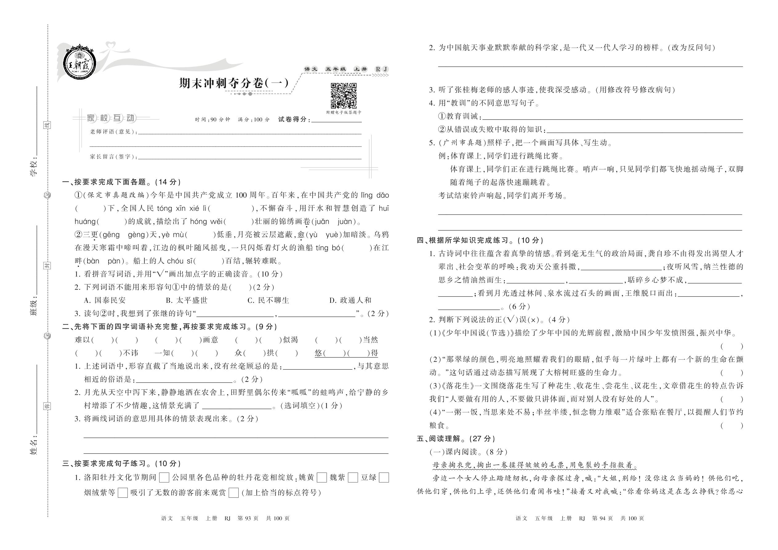 2021上册五年级语文人教版 期末冲刺夺分卷(一)