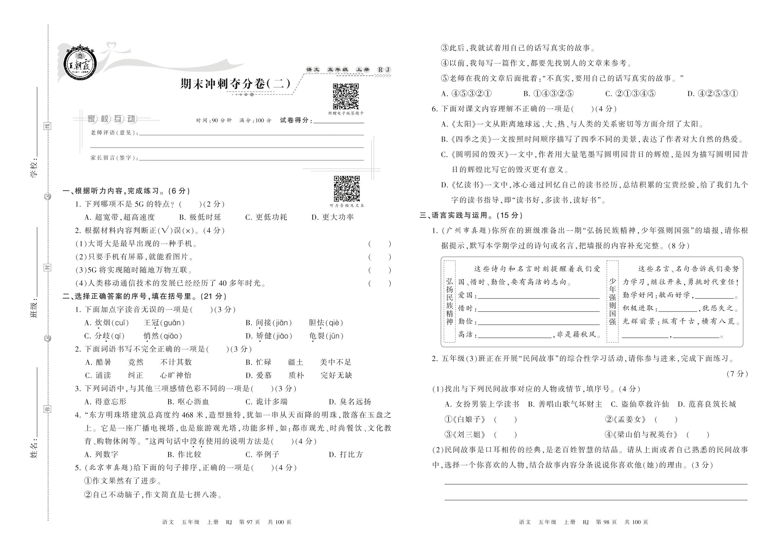 2021上册五年级语文人教版 期末冲刺夺分卷(二)
