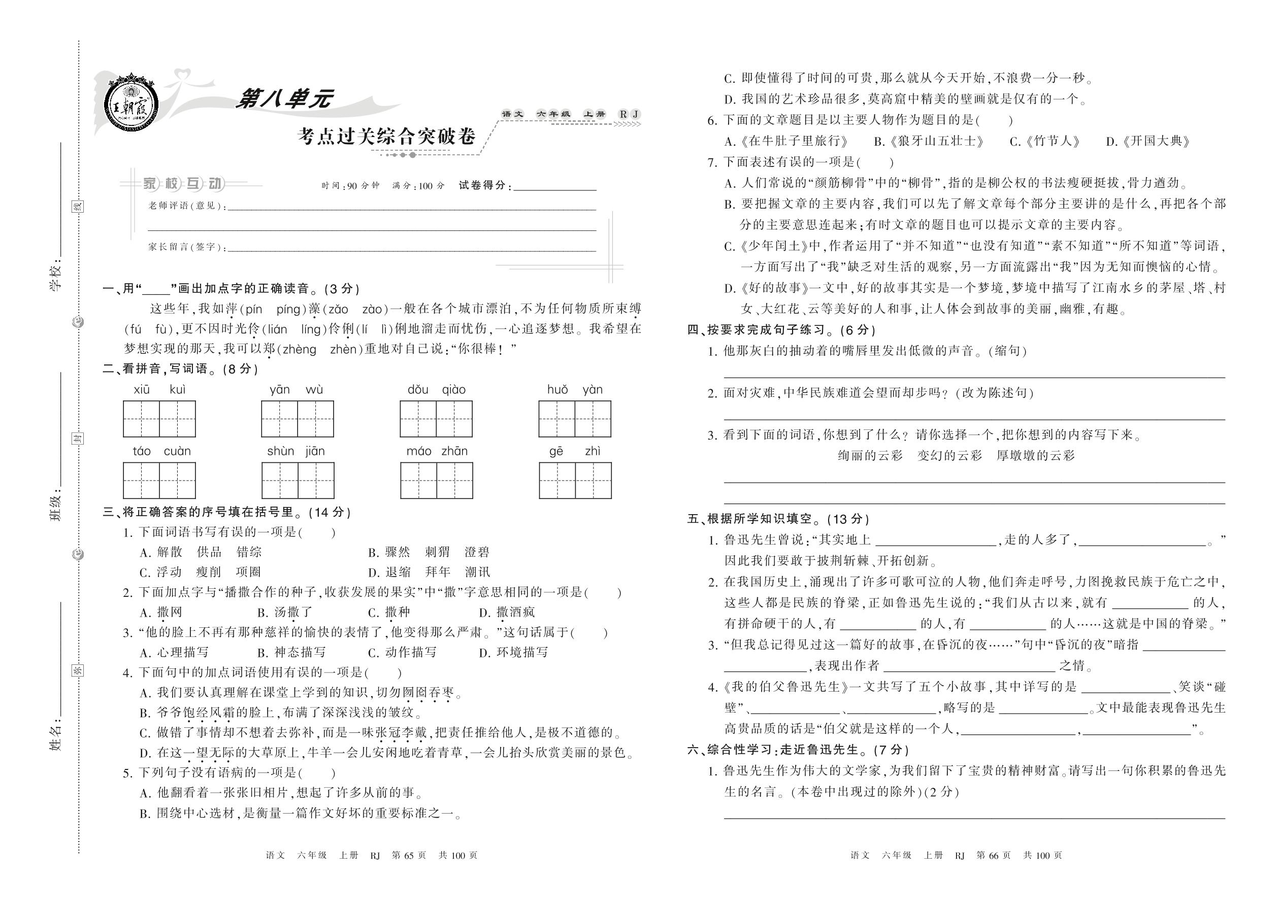 2021上册六年级语文人教版 第八单元 考点过关综合突破卷