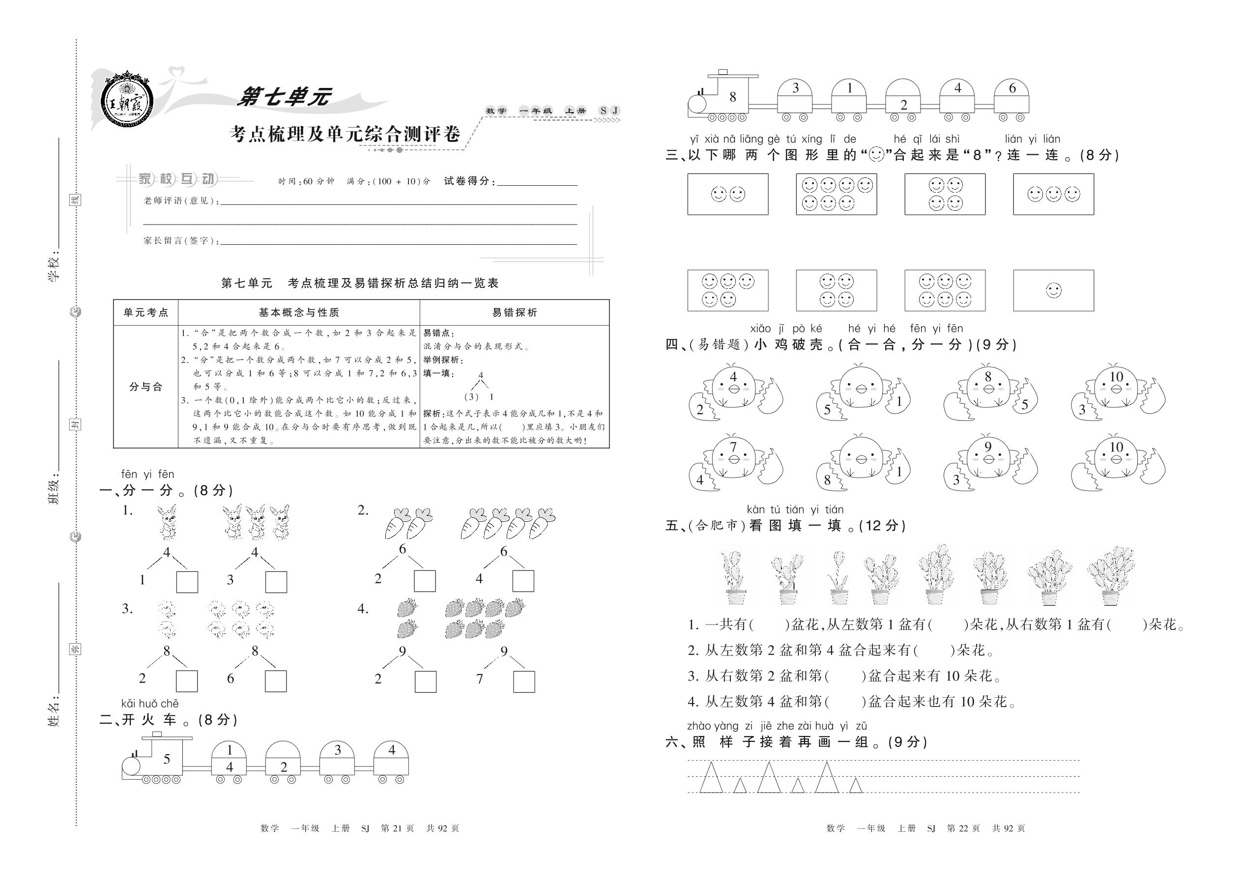 2021上册一年级数学苏教版 第七单元 考点梳理及单元综合测评卷