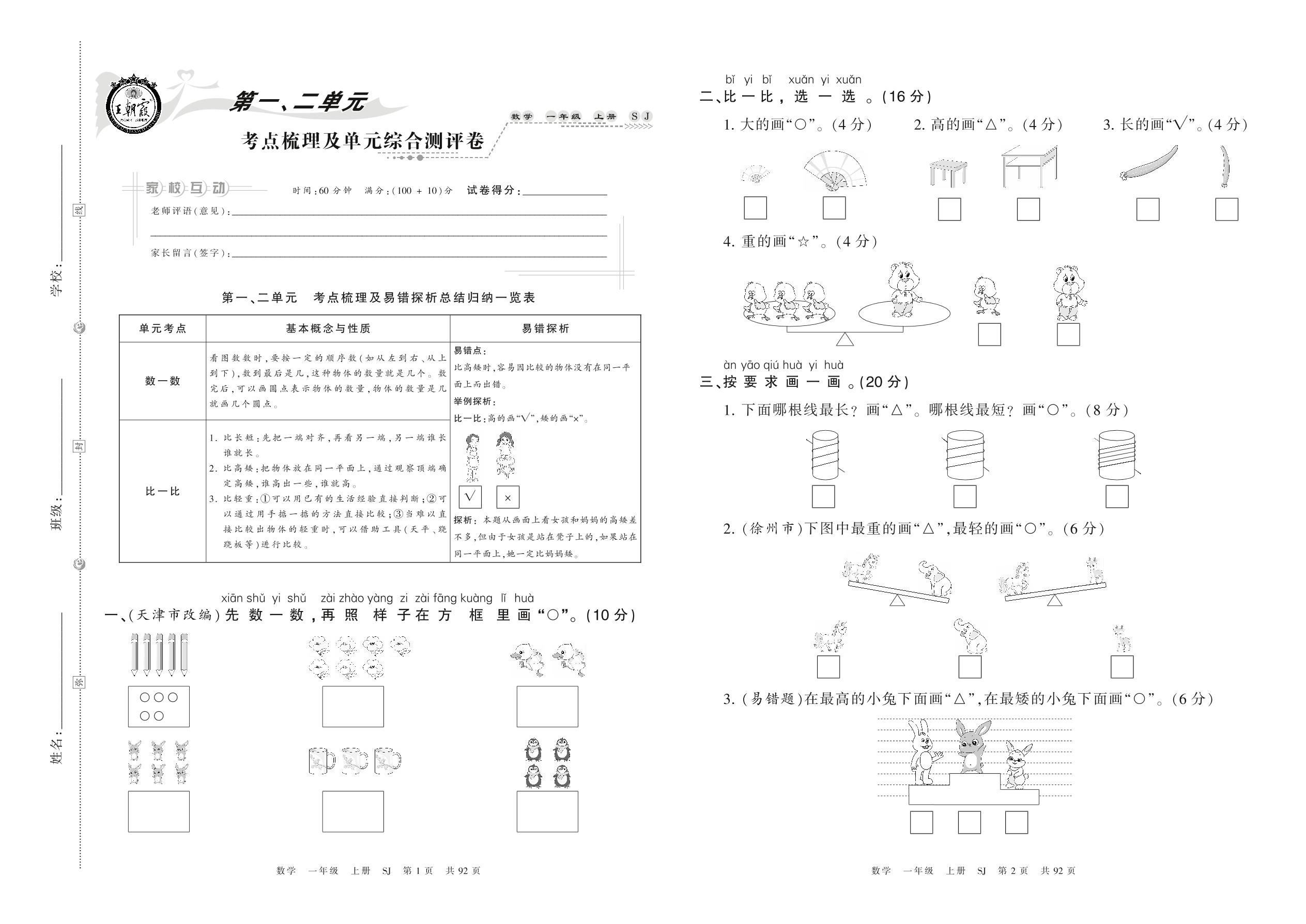 2021上册一年级数学苏教版 第一、二单元 考点梳理及单元综合测评卷