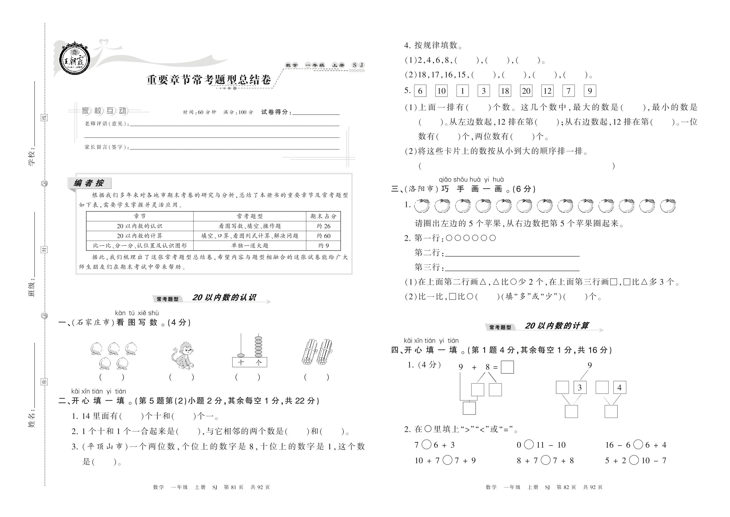 2021上册一年级数学苏教版 重要章节常考题型总结卷