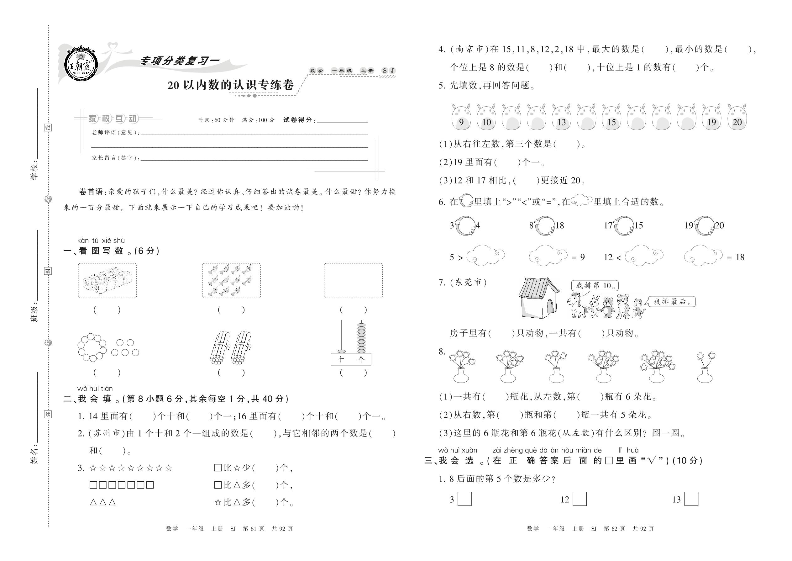 2021上册一年级数学苏教版 20以内数的认识专练卷