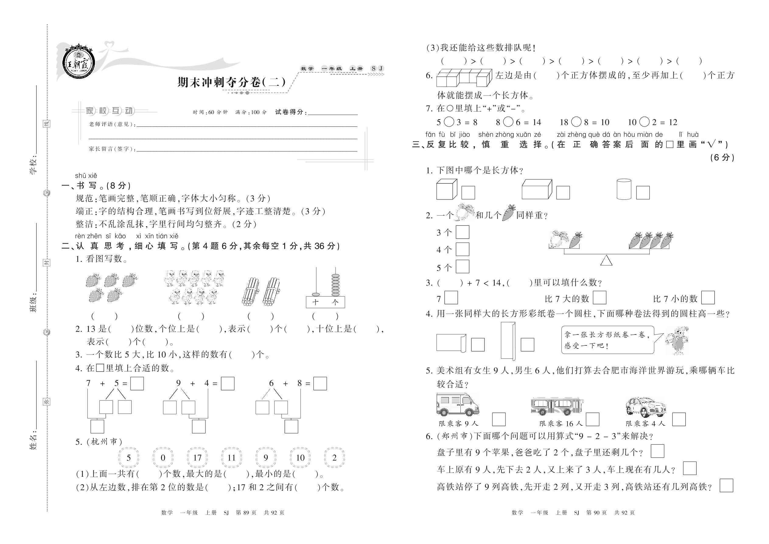 2021上册一年级数学苏教版 期末冲刺夺分卷(二)