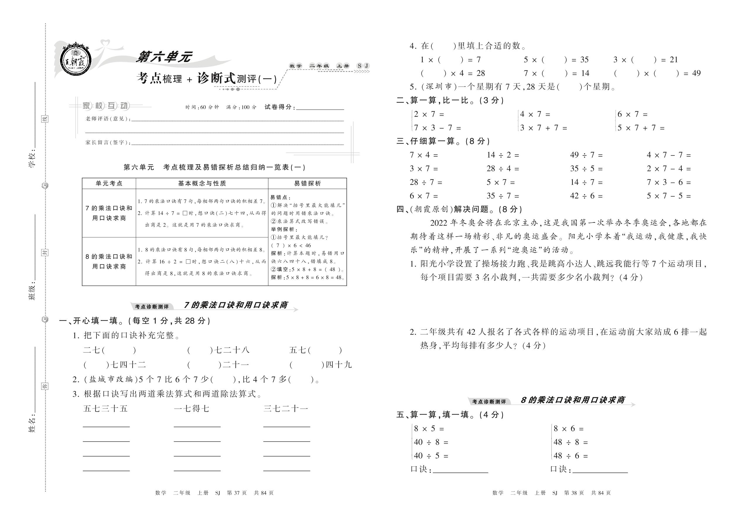 2021上册二年级数学苏教版 第六单元 考点梳理 + 诊断式测评(一)