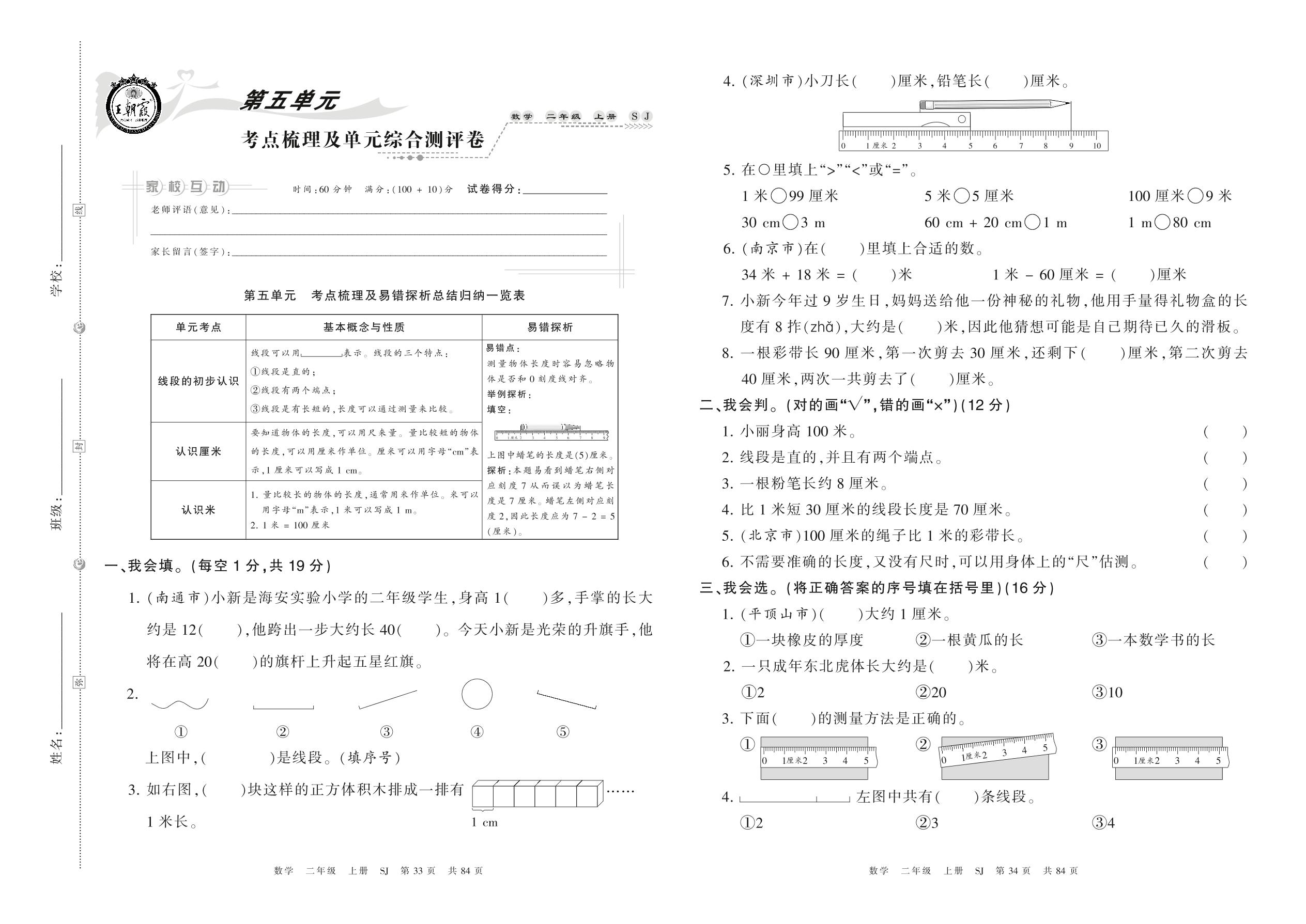 2021上册二年级数学苏教版 第五单元 考点梳理及单元综合测评卷