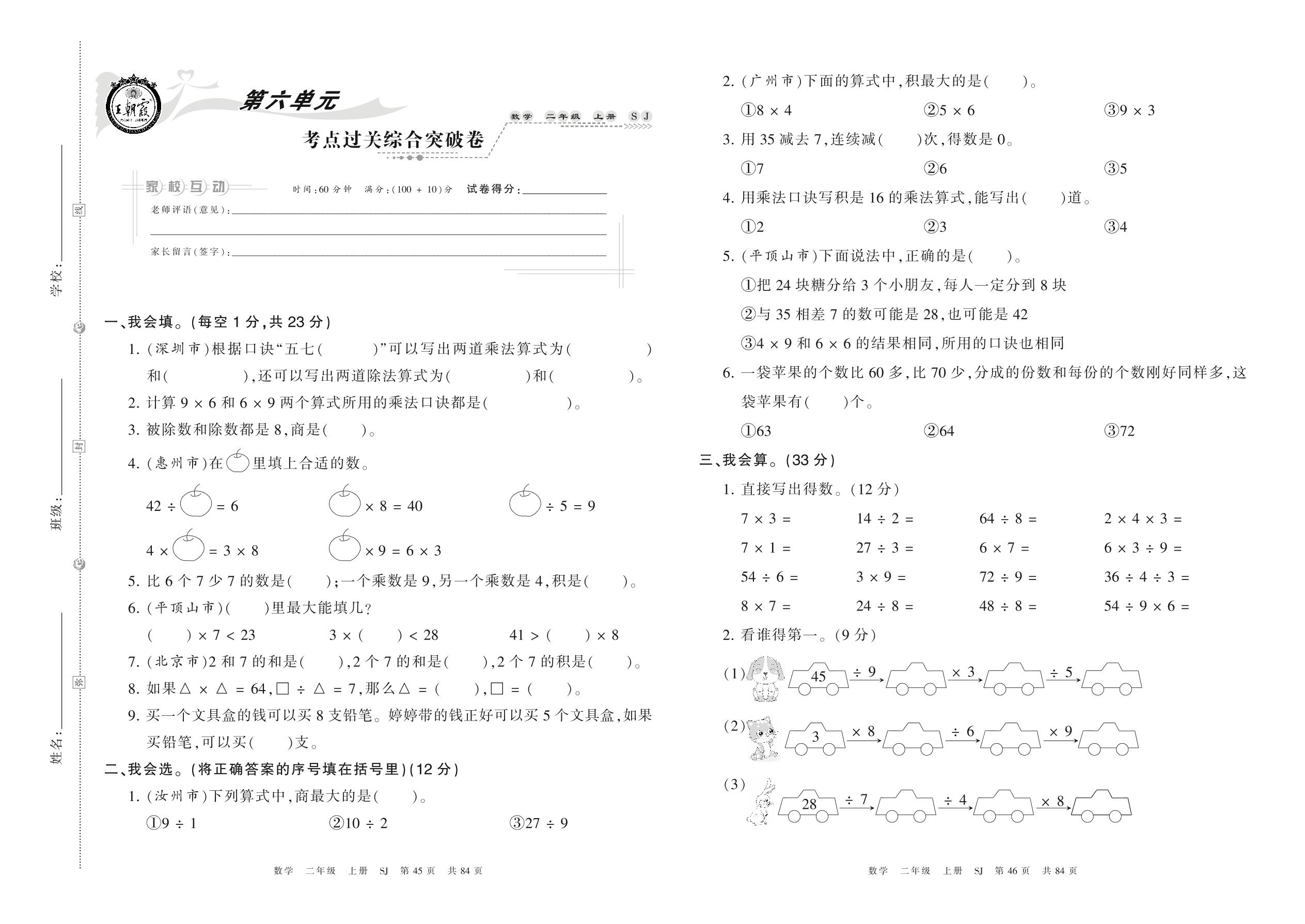 2021上册二年级数学苏教版 第六单元 考点过关综合突破卷