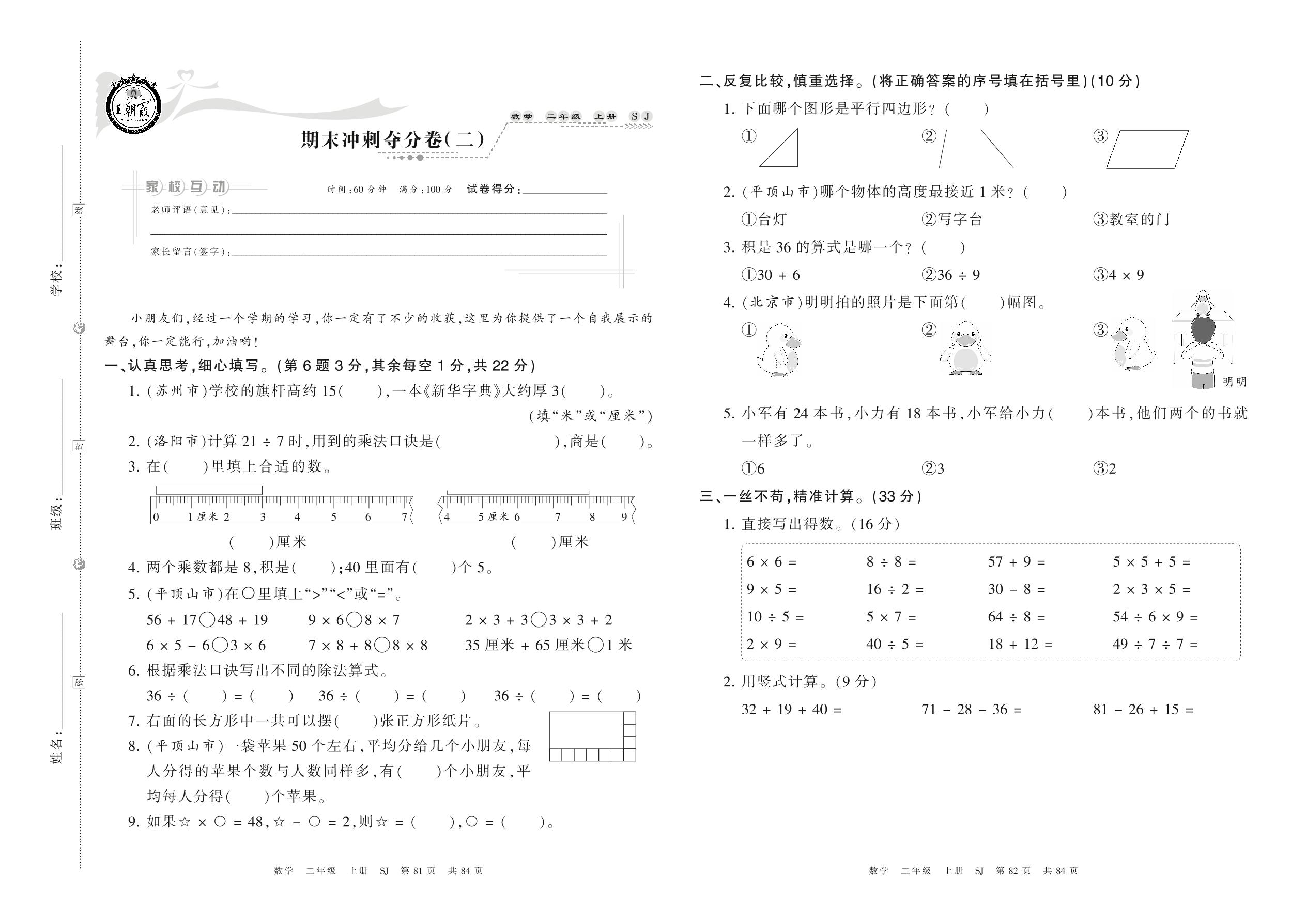 二年级数学苏教版上册期末卷