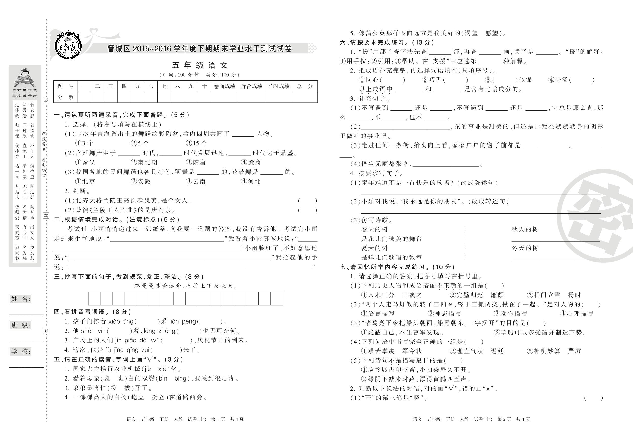 2015-2016学年第二学期郑州市管城区五年级语文试卷(人教版)【10】