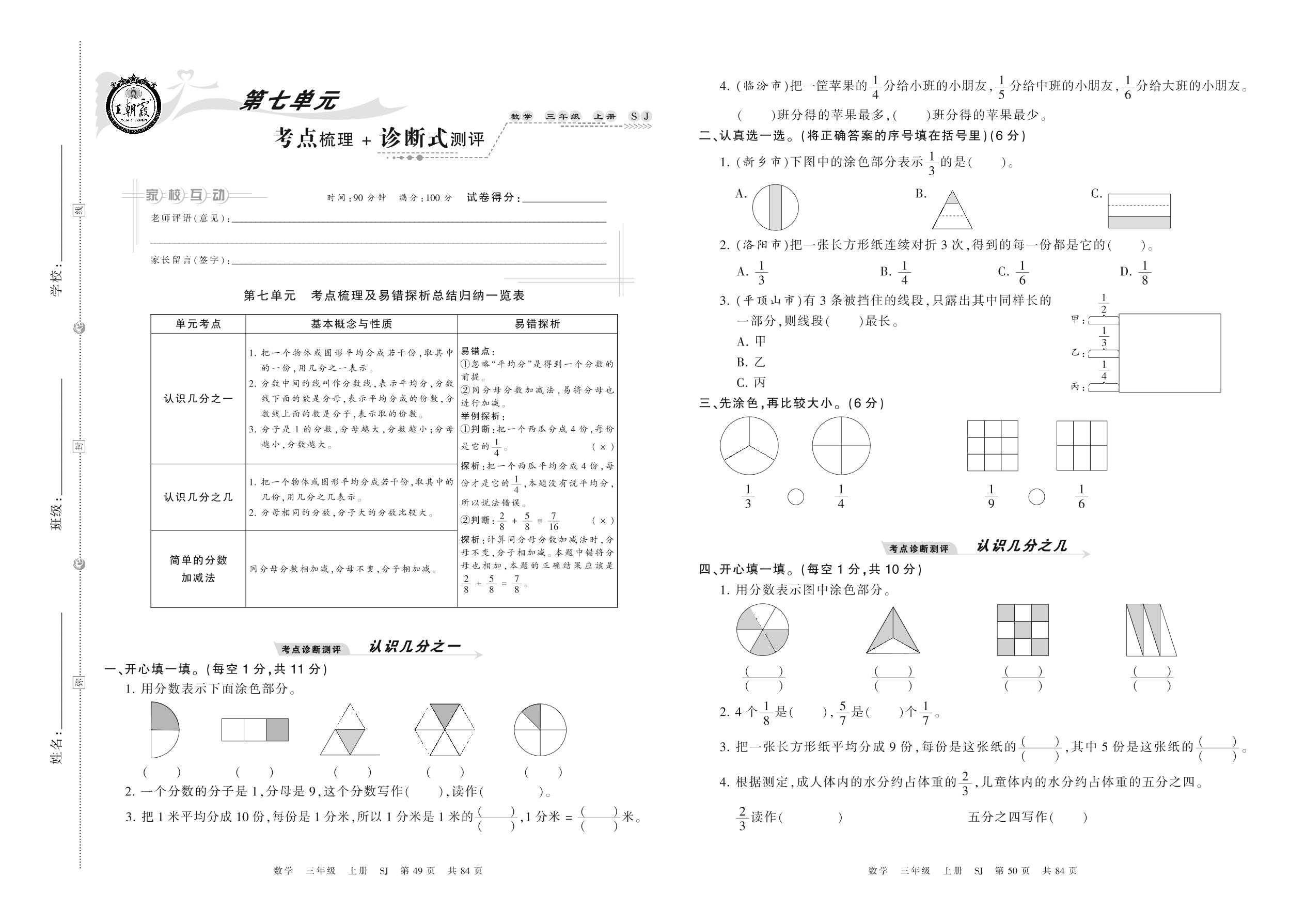 2021上册三年级数学苏教版 第七单元 考点梳理 + 诊断式测评