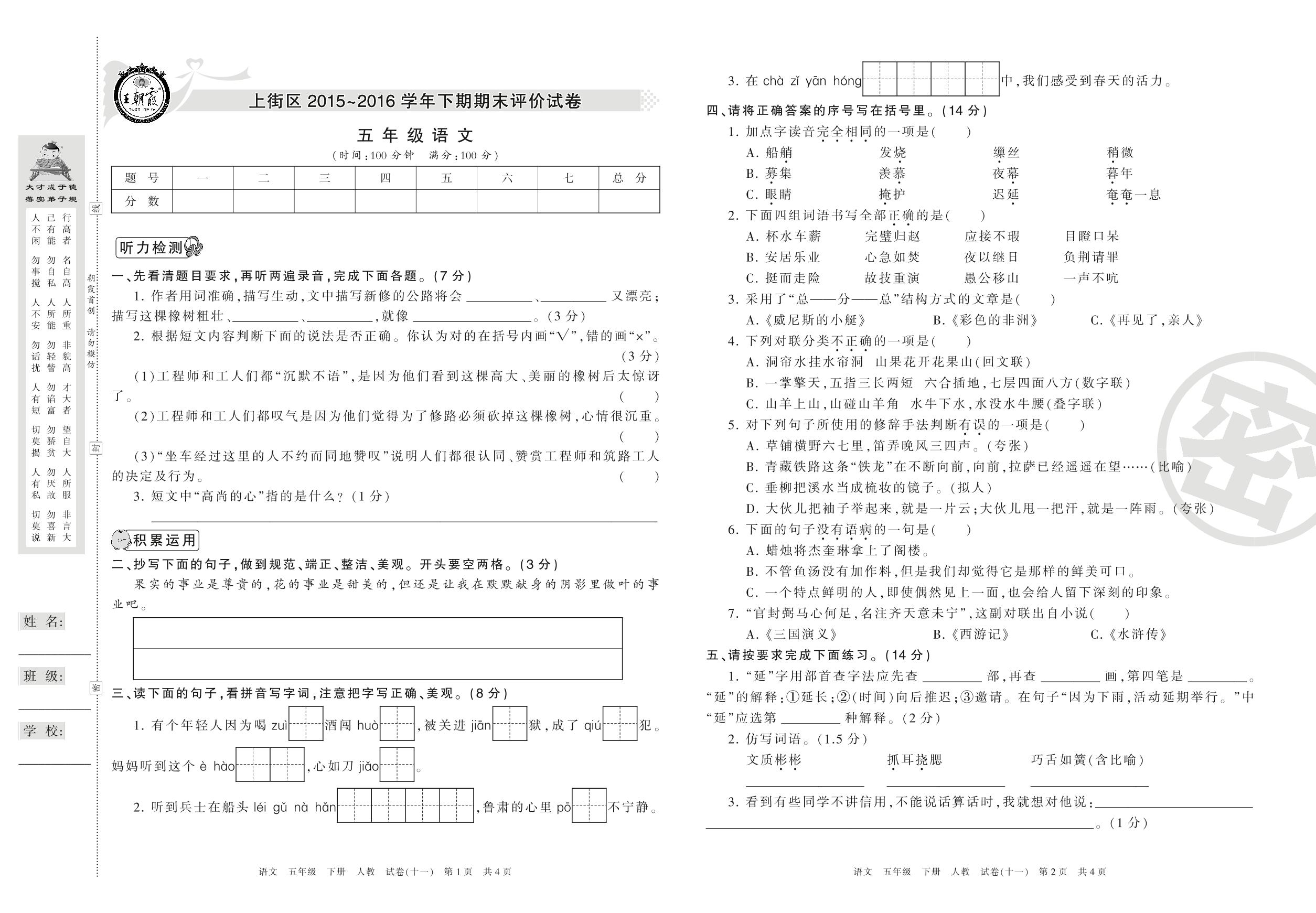 2015-2016学年第二学期郑州市上街区五年级语文试卷(人教版)【11】