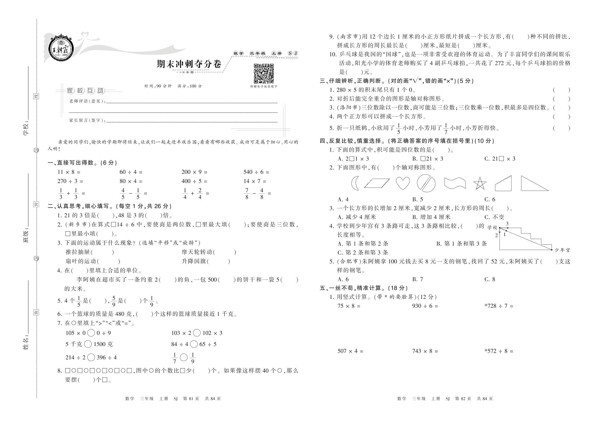 2021上册三年级数学苏教版 期末冲刺夺分卷